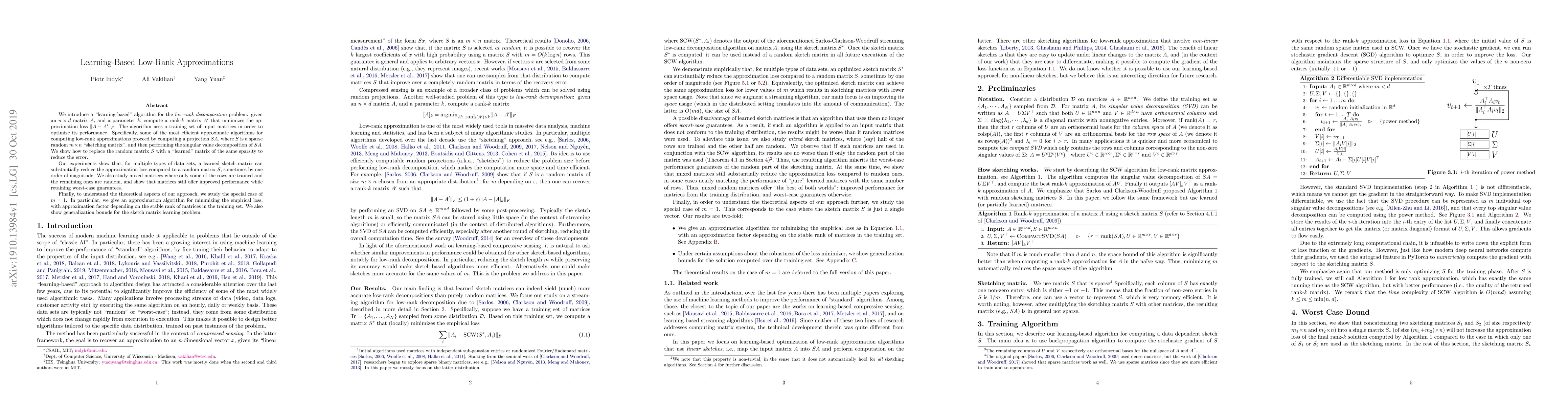 This paper introduces a learning-based algorithm for low-rank matrix approximation, replacing random sketching matrices with learned ones to reduce error. Experiments demonstrate significant reductions in approximation loss compared to random matrices, and theoretical analysis provides generalization bounds for the learned approach.