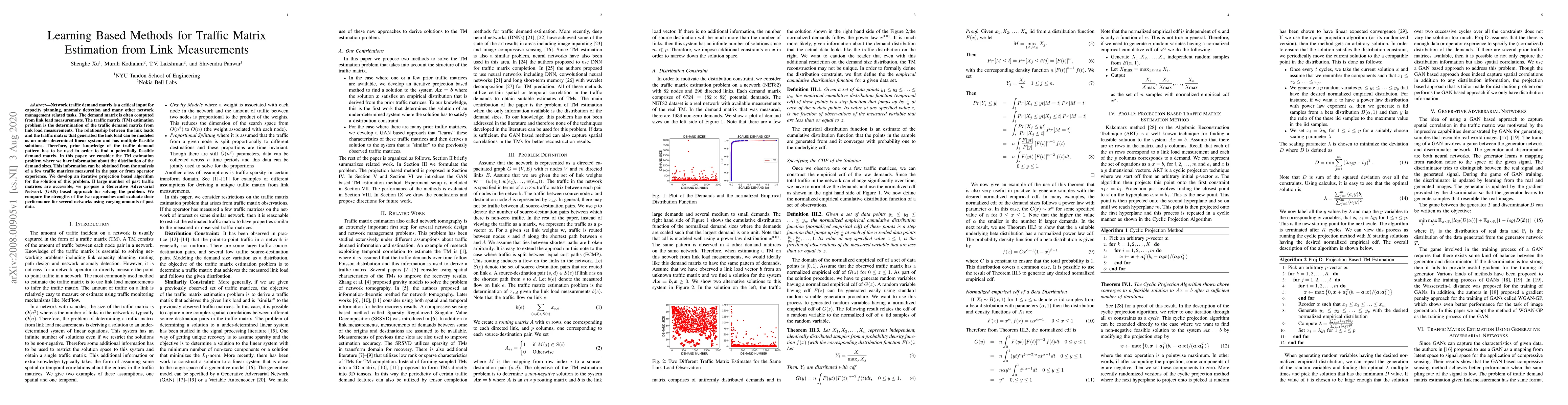 This paper explores learning-based methods for estimating traffic matrices from link load measurements, focusing on iterative projection and Generative Adversarial Network (GAN) approaches. The study evaluates both methods' performance using historical traffic data and compares them across various networks.