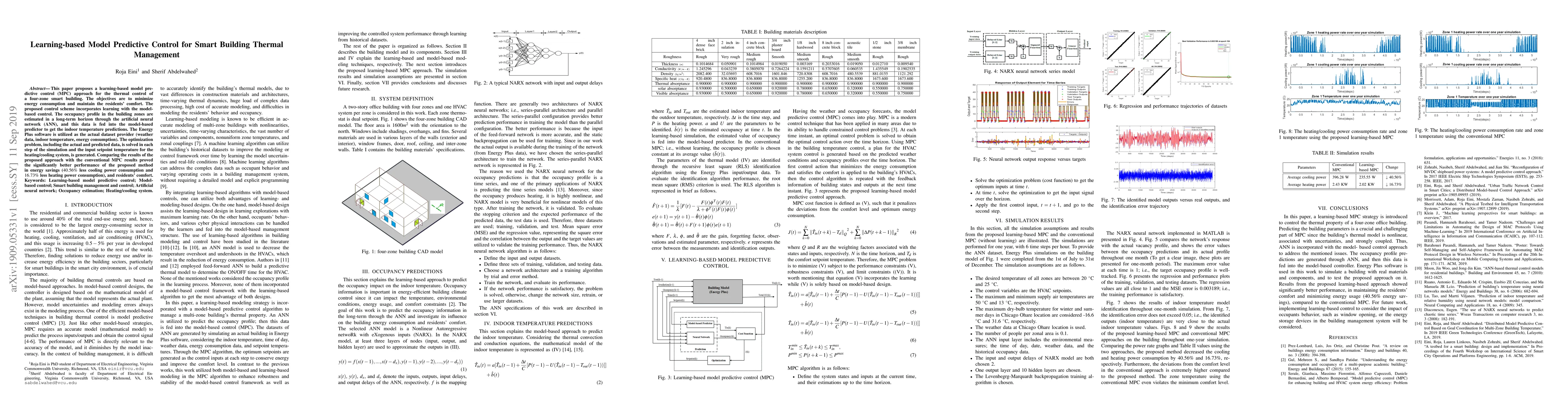 This paper proposes a learning-based model predictive control (MPC) approach for the thermal control of a four-zone smart building. The objectives are to minimize energy consumption and maintain the residents' comfort. The proposed control scheme incorporates learning with the model-based control. The occupancy profile in the building zones are estimated in a long-term horizon through the artificial neural network (ANN), and this data is fed into the model-based predictor to get the indoor temperature predictions. The Energy Plus software is utilized as the actual dataset provider (weather data, indoor temperature, energy consumption). The optimization problem, including the actual and predicted data, is solved in each step of the simulation and the input setpoint temperature for the heating/cooling system, is generated. Comparing the results of the proposed approach with the conventional MPC results proved the significantly better performance of the proposed method in energy savings (40.56% less cooling power consumption and 16.73% less heating power consumption), and residents' comfort.