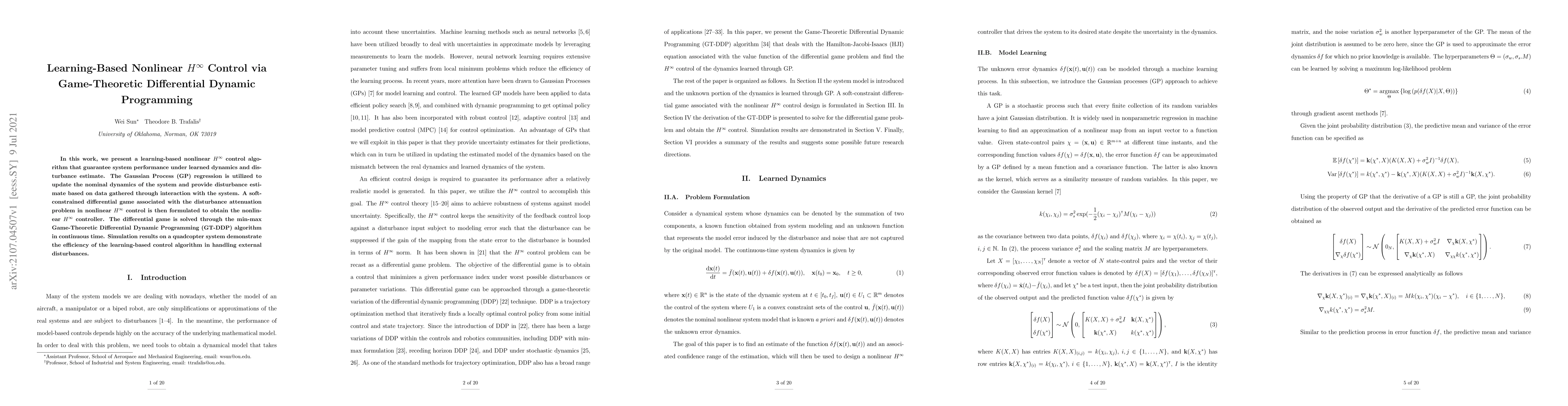 This paper proposes a learning-based nonlinear $H^\infty$ control algorithm using Gaussian Process regression to update system dynamics and estimate disturbances. The method employs a differential game-theoretic approach solved via the min-max Game-Theoretic Differential Dynamic Programming algorithm to achieve optimal control, demonstrated effectively in a quadcopter system.