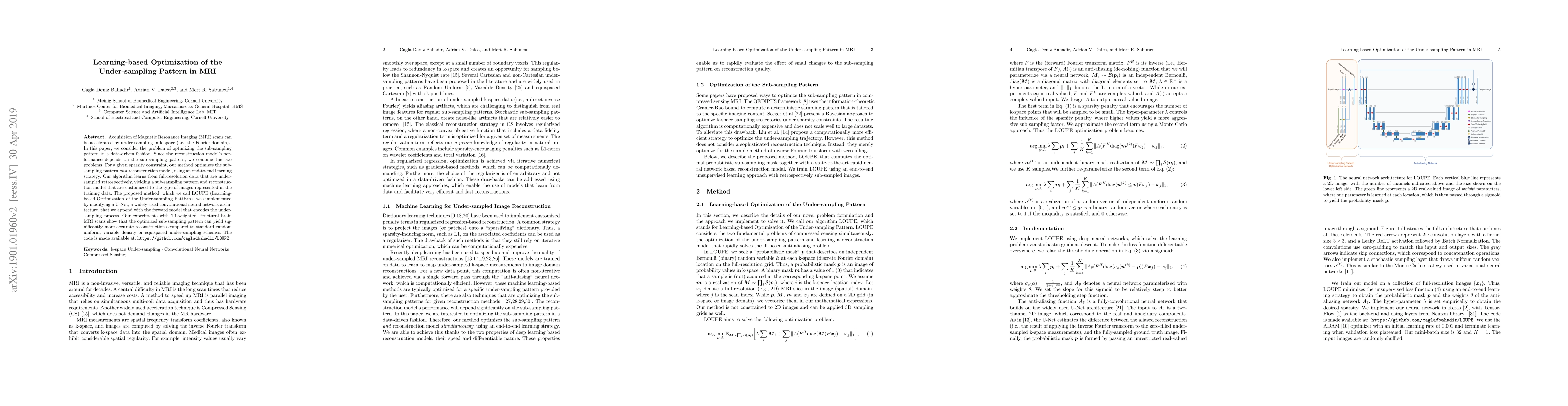 This paper proposes LOUPE, a learning-based optimization method for MRI under-sampling patterns, which combines sub-sampling pattern optimization with reconstruction model training using an end-to-end learning strategy. The method, implemented via a modified U-Net, yields customized sub-sampling patterns and reconstruction models that significantly improve reconstruction accuracy compared to conventional methods.
