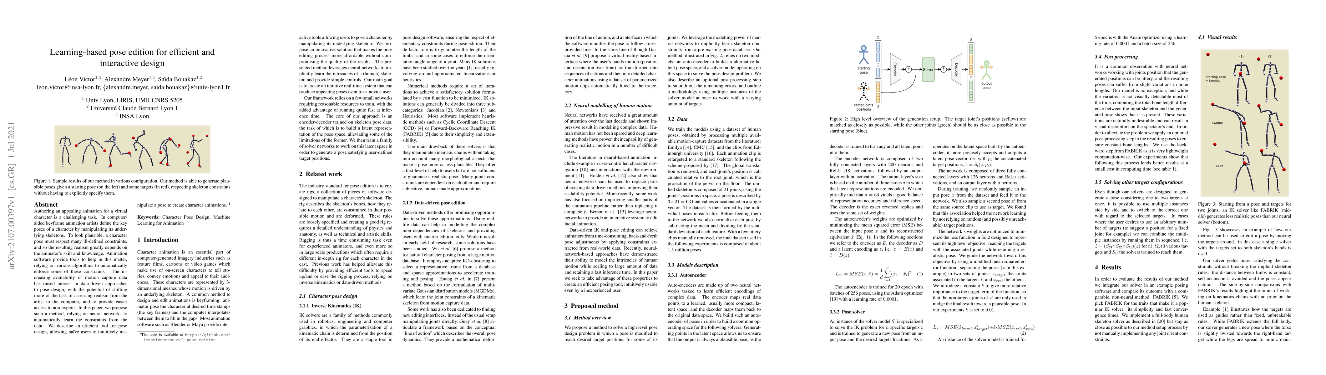 Authoring an appealing animation for a virtual character is a challenging task. In computer-aided keyframe animation artists define the key poses of a character by manipulating its underlying skeletons. To look plausible, a character pose must respect many ill-defined constraints, and so the resulting realism greatly depends on the animator's skill and knowledge. Animation software provide tools to help in this matter, relying on various algorithms to automatically enforce some of these constraints. The increasing availability of motion capture data has raised interest in data-driven approaches to pose design, with the potential of shifting more of the task of assessing realism from the artist to the computer, and to provide easier access to nonexperts. In this article, we propose such a method, relying on neural networks to automatically learn the constraints from the data. We describe an efficient tool for pose design, allowing na{\"i}ve users to intuitively manipulate a pose to create character animations.