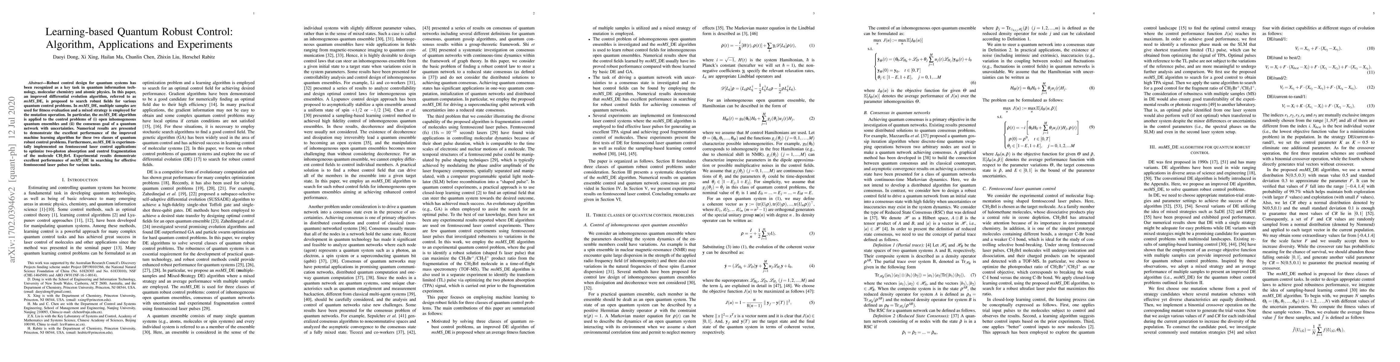 This paper proposes an improved differential evolution algorithm, msMS_DE, for robust quantum control, demonstrating its effectiveness in controlling open quantum ensembles and achieving consensus in quantum networks. Experimental results on femtosecond laser applications show msMS_DE's success in optimizing two-photon absorption and molecular fragmentation.