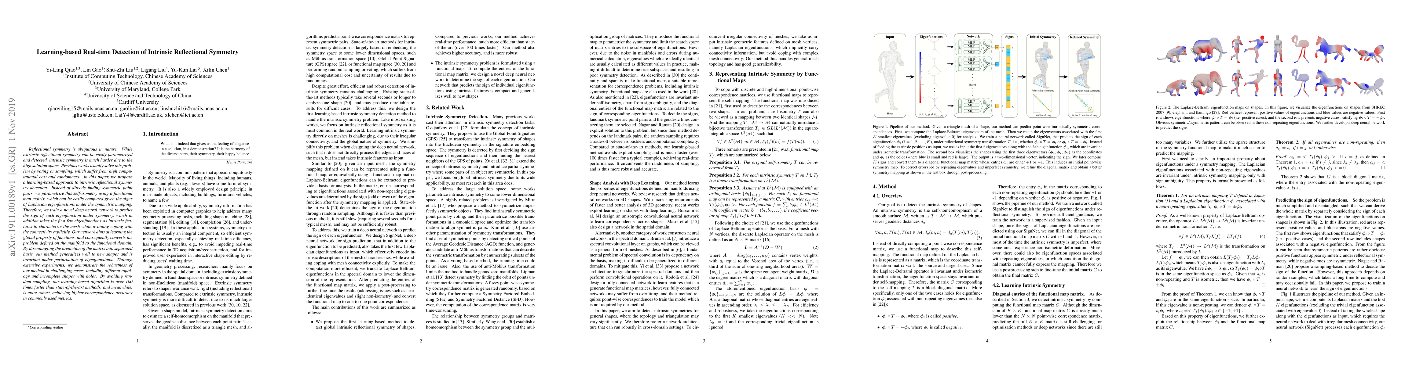 Reflectional symmetry is ubiquitous in nature. While extrinsic reflectional symmetry can be easily parametrized and detected, intrinsic symmetry is much harder due to the high solution space. Previous works usually solve this problem by voting or sampling, which suffer from high computational cost and randomness. In this paper, we propose \YL{a} learning-based approach to intrinsic reflectional symmetry detection. Instead of directly finding symmetric point pairs, we parametrize this self-isometry using a functional map matrix, which can be easily computed given the signs of Laplacian eigenfunctions under the symmetric mapping. Therefore, we train a novel deep neural network to predict the sign of each eigenfunction under symmetry, which in addition takes the first few eigenfunctions as intrinsic features to characterize the mesh while avoiding coping with the connectivity explicitly. Our network aims at learning the global property of functions, and consequently converts the problem defined on the manifold to the functional domain. By disentangling the prediction of the matrix into separated basis, our method generalizes well to new shapes and is invariant under perturbation of eigenfunctions. Through extensive experiments, we demonstrate the robustness of our method in challenging cases, including different topology and incomplete shapes with holes. By avoiding random sampling, our learning-based algorithm is over 100 times faster than state-of-the-art methods, and meanwhile, is more robust, achieving higher correspondence accuracy in commonly used metrics.