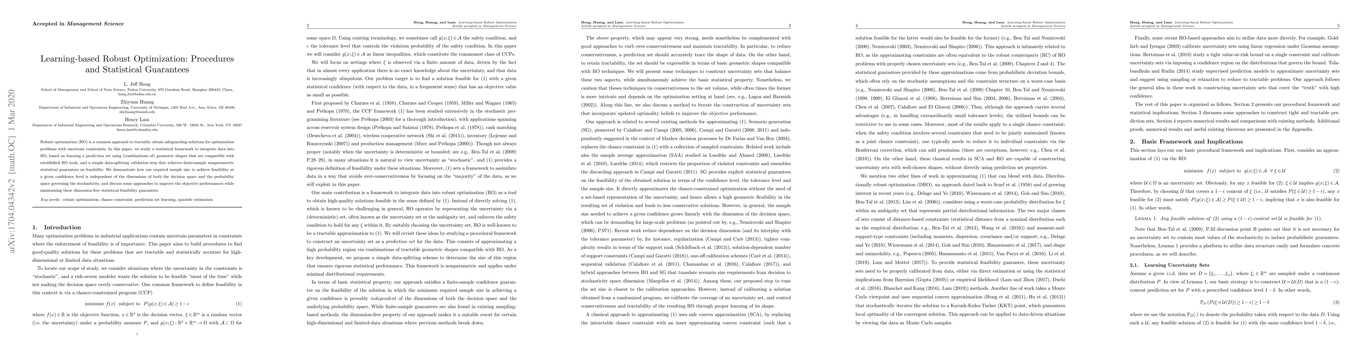 This paper proposes a learning-based framework for robust optimization that integrates data to achieve safeguarding solutions for uncertain constraints. It demonstrates dimension-free statistical guarantees on feasibility, independent of decision and probability space dimensions, and discusses methods to enhance objective performance.