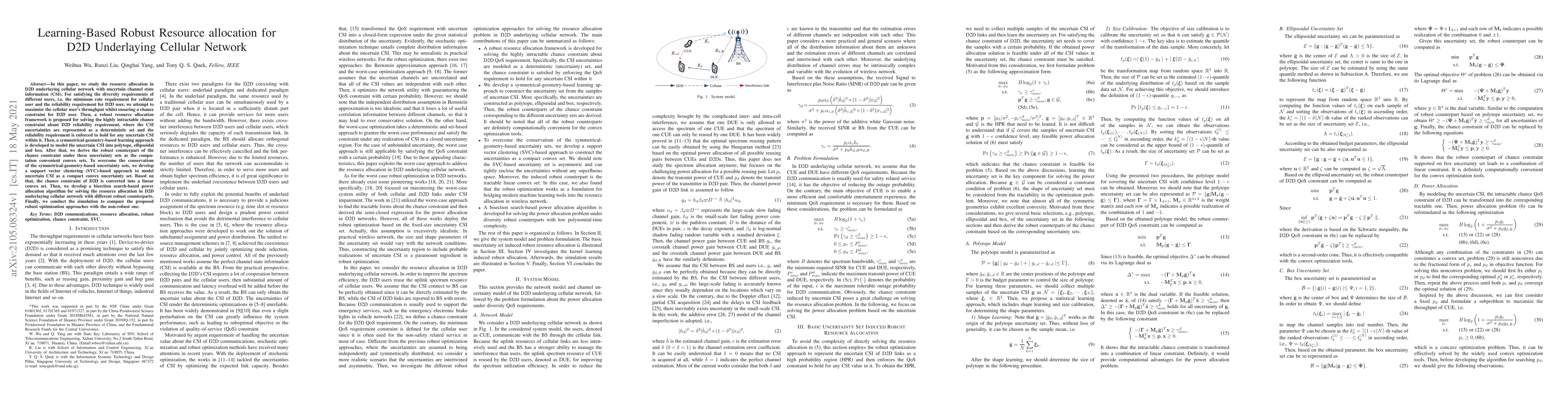 In this paper, we study the resource allocation in D2D underlaying cellular network with uncertain channel state information (CSI). For satisfying the diversity requirements of different users, i.e. the minimum rate requirement for cellular user and the reliability requirement for D2D user, we attempt to maximize the cellular user's throughput whilst ensuring a chance constraint for D2D user. Then, a robust resource allocation framework is proposed for solving the highly intractable chance constraint about D2D reliability requirement, where the CSI uncertainties are represented as a deterministic set and the reliability requirement is enforced to hold for any uncertain CSI within it. Then, a symmetrical-geometry-based learning approach is developed to model the uncertain CSI into polytope, ellipsoidal and box. After that, we derive the robust counterpart of the chance constraint under these uncertainty sets as the computation convenient convex sets. To overcome the conservatism of the symmetrical-geometry-based uncertainty sets, we develop a support vector clustering (SVC)-based approach to model uncertain CSI as a compact convex uncertainty set. Based on that, the chance constraint of D2D is converted into a linear convex set. Then, we develop a bisection search-based power allocation algorithm for solving the resource allocation in D2D underlaying cellular network with different robust counterparts. Finally, we conduct the simulation to compare the proposed robust optimization approaches with the non-robust one.