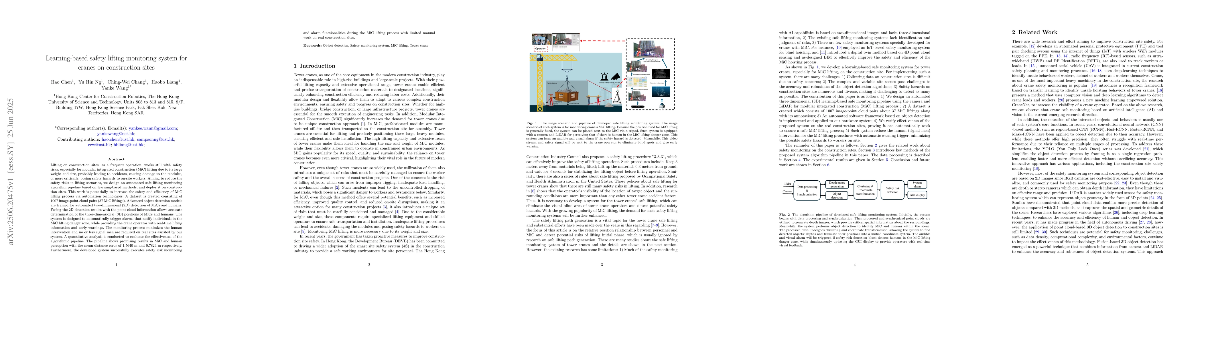 Lifting on construction sites, as a frequent operation, works still with safety risks, especially for modular integrated construction (MiC) lifting due to its large weight and size, probably leading to accidents, causing damage to the modules, or more critically, posing safety hazards to on-site workers. Aiming to reduce the safety risks in lifting scenarios, we design an automated safe lifting monitoring algorithm pipeline based on learning-based methods, and deploy it on construction sites. This work is potentially to increase the safety and efficiency of MiC lifting process via automation technologies. A dataset is created consisting of 1007 image-point cloud pairs (37 MiC liftings). Advanced object detection models are trained for automated two-dimensional (2D) detection of MiCs and humans. Fusing the 2D detection results with the point cloud information allows accurate determination of the three-dimensional (3D) positions of MiCs and humans. The system is designed to automatically trigger alarms that notify individuals in the MiC lifting danger zone, while providing the crane operator with real-time lifting information and early warnings. The monitoring process minimizes the human intervention and no or less signal men are required on real sites assisted by our system. A quantitative analysis is conducted to evaluate the effectiveness of the algorithmic pipeline. The pipeline shows promising results in MiC and human perception with the mean distance error of 1.5640 m and 0.7824 m respectively. Furthermore, the developed system successfully executes safety risk monitoring and alarm functionalities during the MiC lifting process with limited manual work on real construction sites.