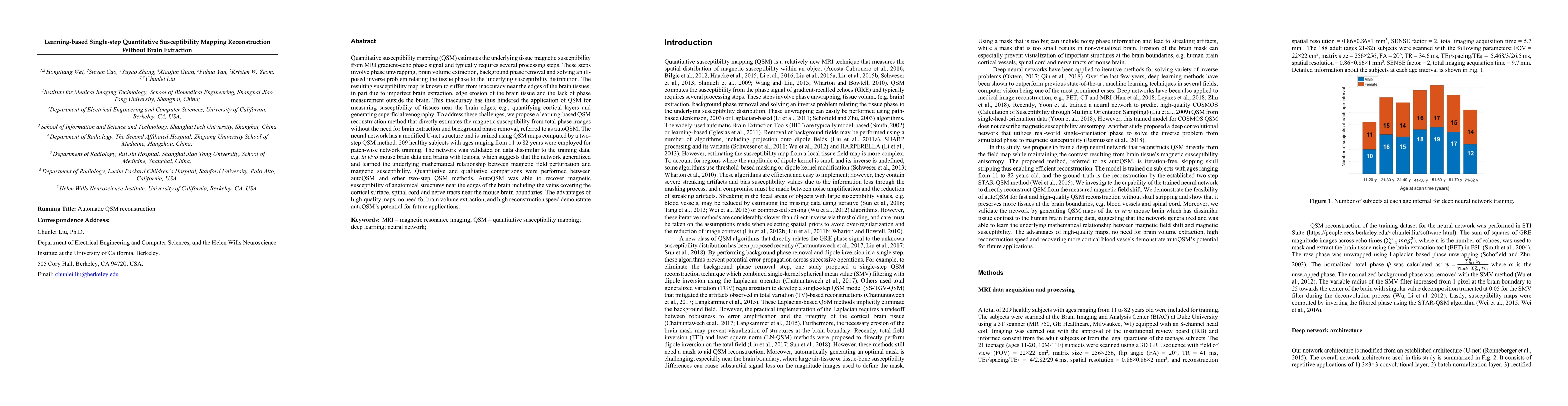 This paper proposes a learning-based method, autoQSM, for single-step quantitative susceptibility mapping (QSM) without brain extraction, using a modified U-net neural network trained on data from 209 subjects. The method shows high accuracy in mapping magnetic susceptibility near brain edges, demonstrating potential for applications like cortical layer quantification and superficial venography.