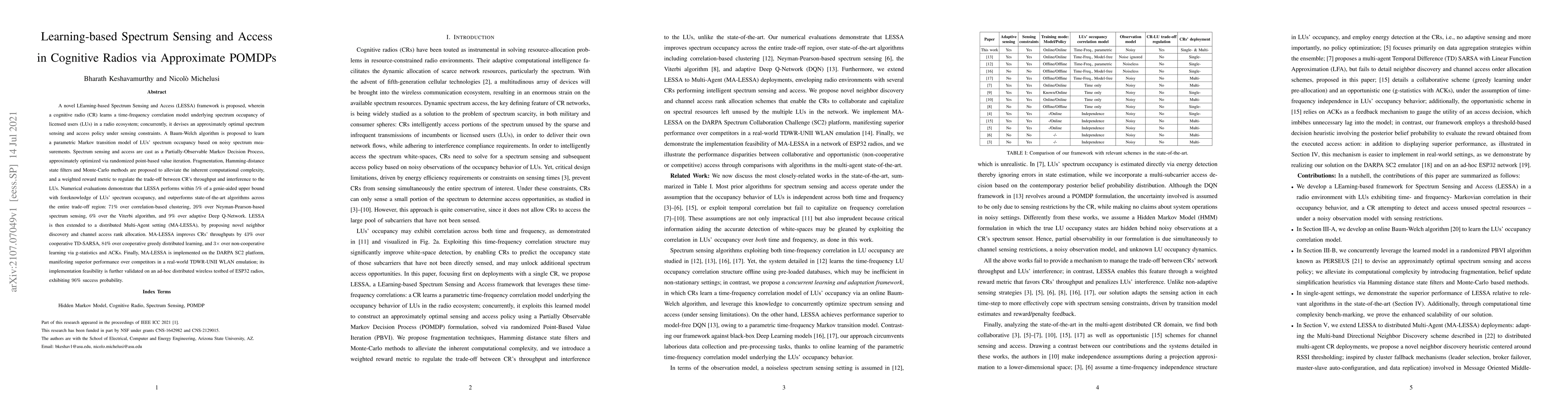 The paper proposes LESSA, a learning-based framework for cognitive radios that optimizes spectrum sensing and access via approximate POMDPs, achieving near-optimal performance and outperforming state-of-the-art algorithms. It extends to a distributed multi-agent setting (MA-LESSA) that significantly enhances cognitive radio throughput and is validated in real-world emulations and testbeds.