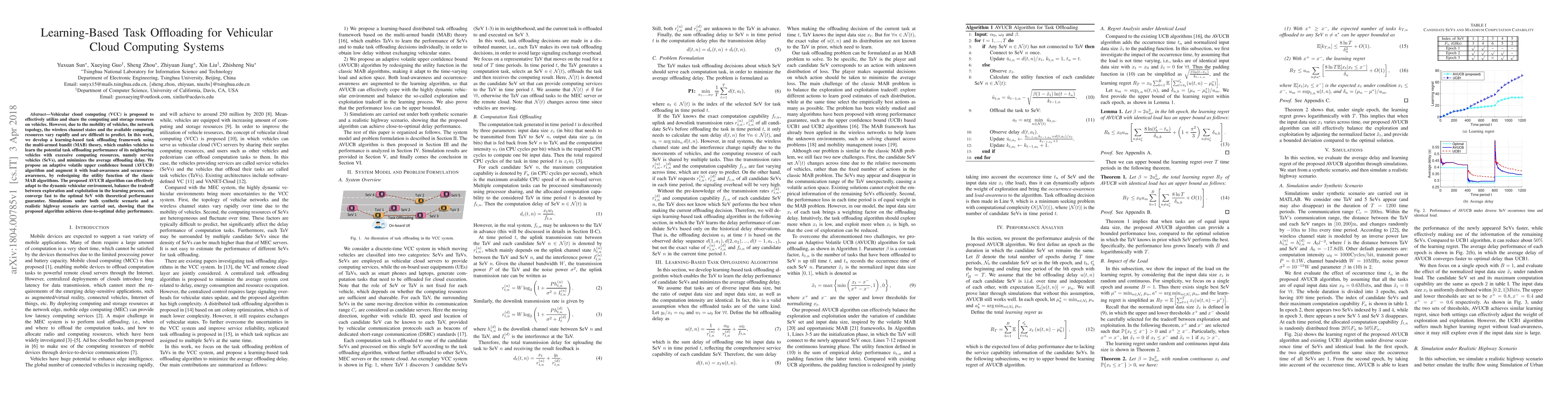 This paper proposes a learning-based task offloading framework for vehicular cloud computing using multi-armed bandit theory to minimize average offloading delay. The adaptive volatile upper confidence bound (AVUCB) algorithm is introduced to dynamically adapt to the changing environment, balancing exploration and exploitation, and achieving near-optimal performance.