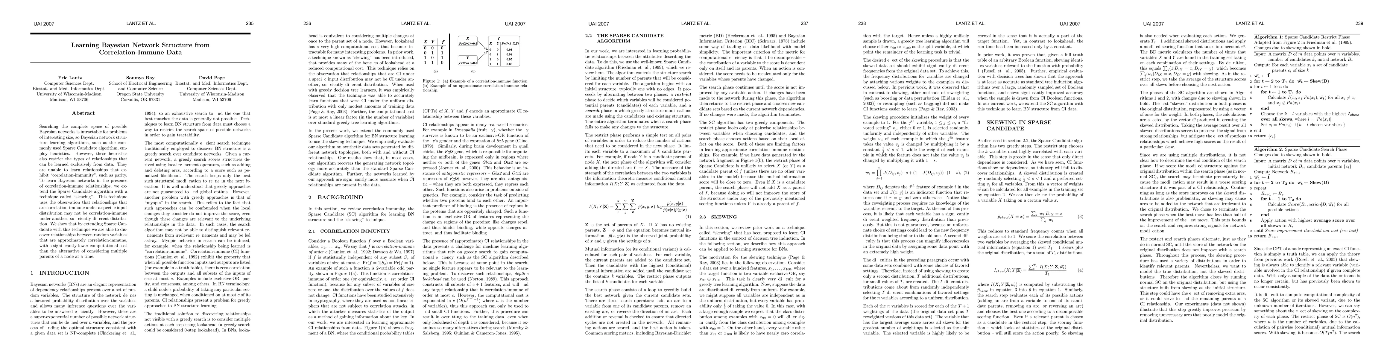 This paper proposes an extension of the Sparse Candidate algorithm to learn Bayesian network structures from data containing correlation-immune relationships, such as parity. The introduced "skewing" technique leverages different input distributions to identify these relationships at a lower computational cost compared to traditional methods.