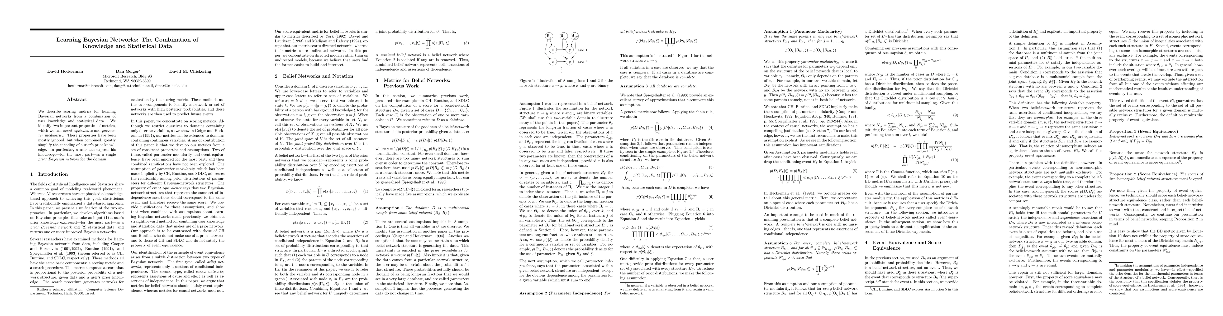We describe algorithms for learning Bayesian networks from a combination of user knowledge and statistical data. The algorithms have two components: a scoring metric and a search procedure. The scoring metric takes a network structure, statistical data, and a user's prior knowledge, and returns a score proportional to the posterior probability of the network structure given the data. The search procedure generates networks for evaluation by the scoring metric. Our contributions are threefold. First, we identify two important properties of metrics, which we call event equivalence and parameter modularity. These properties have been mostly ignored, but when combined, greatly simplify the encoding of a user's prior knowledge. In particular, a user can express her knowledge-for the most part-as a single prior Bayesian network for the domain. Second, we describe local search and annealing algorithms to be used in conjunction with scoring metrics. In the special case where each node has at most one parent, we show that heuristic search can be replaced with a polynomial algorithm to identify the networks with the highest score. Third, we describe a methodology for evaluating Bayesian-network learning algorithms. We apply this approach to a comparison of metrics and search procedures.