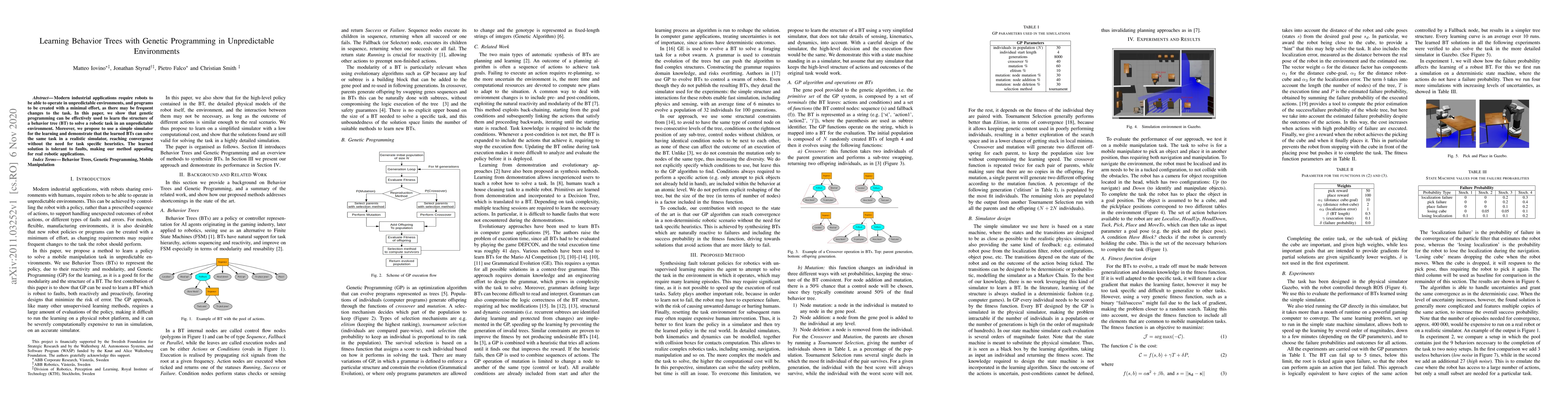 This paper explores using genetic programming to automatically learn behavior tree structures for robots to perform tasks in unpredictable environments. The method demonstrates success in a simulator and shows the learned behavior trees can adapt to faults, promising for practical robotic applications.