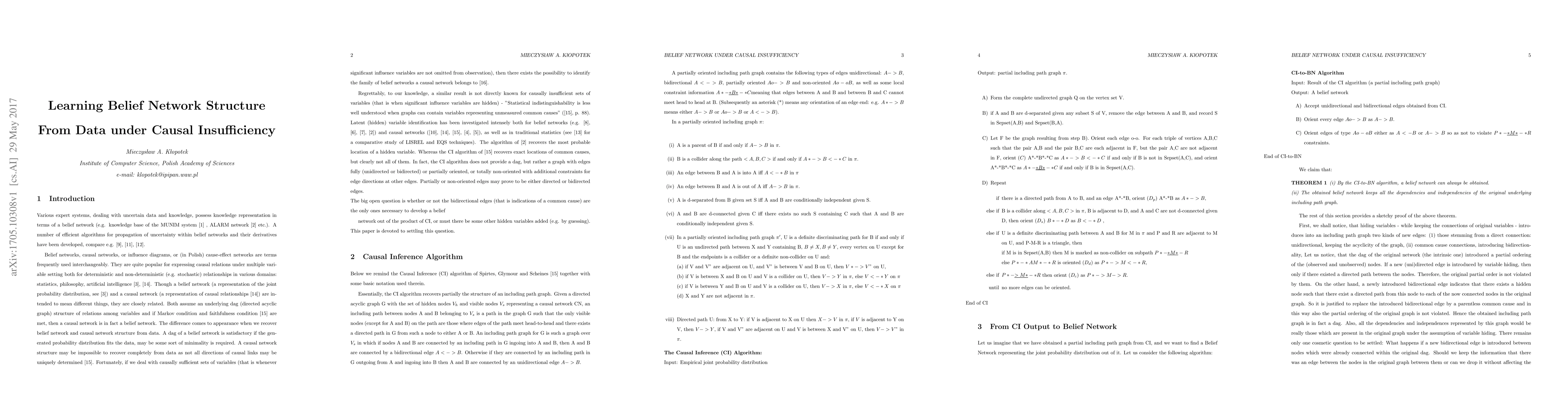 Though a belief network (a representation of the joint probability distribution, see [3]) and a causal network (a representation of causal relationships [14]) are intended to mean different things, they are closely related. Both assume an underlying dag (directed acyclic graph) structure of relations among variables and if Markov condition and faithfulness condition [15] are met, then a causal network is in fact a belief network. The difference comes to appearance when we recover belief network and causal network structure from data. A causal network structure may be impossible to recover completely from data as not all directions of causal links may be uniquely determined [15]. Fortunately, if we deal with causally sufficient sets of variables (that is whenever significant influence variables are not omitted from observation), then there exists the possibility to identify the family of belief networks a causal network belongs to [16]. Regrettably, to our knowledge, a similar result is not directly known for causally insufficient sets of variables. Spirtes, Glymour and Scheines developed a CI algorithm to handle this situation, but it leaves some important questions open. The big open question is whether or not the bidirectional edges (that is indications of a common cause) are the only ones necessary to develop a belief network out of the product of CI, or must there be some other hidden variables added (e.g. by guessing). This paper is devoted to settling this question.