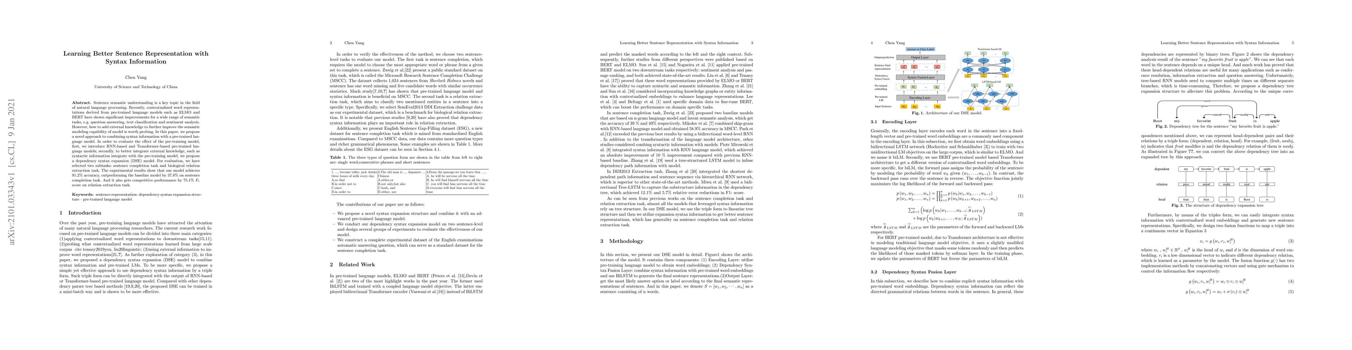Sentence semantic understanding is a key topic in the field of natural language processing. Recently, contextualized word representations derived from pre-trained language models such as ELMO and BERT have shown significant improvements for a wide range of semantic tasks, e.g. question answering, text classification and sentiment analysis. However, how to add external knowledge to further improve the semantic modeling capability of model is worth probing. In this paper, we propose a novel approach to combining syntax information with a pre-trained language model. In order to evaluate the effect of the pre-training model, first, we introduce RNN-based and Transformer-based pre-trained language models; secondly, to better integrate external knowledge, such as syntactic information integrate with the pre-training model, we propose a dependency syntax expansion (DSE) model. For evaluation, we have selected two subtasks: sentence completion task and biological relation extraction task. The experimental results show that our model achieves 91.2\% accuracy, outperforming the baseline model by 37.8\% on sentence completion task. And it also gets competitive performance by 75.1\% $F_{1}$ score on relation extraction task.
