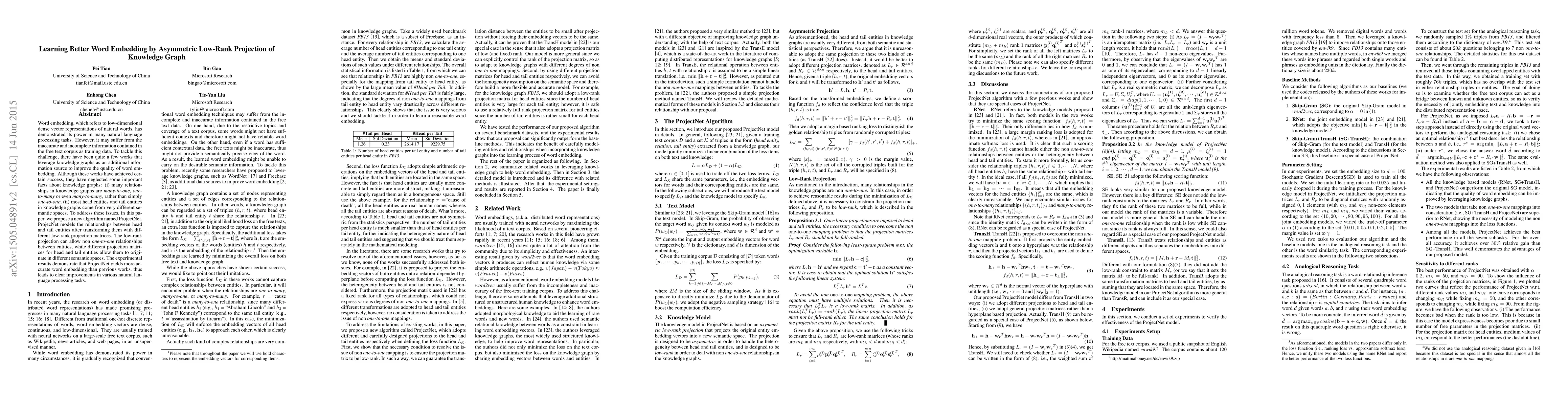 This paper proposes ProjectNet, an algorithm that uses asymmetric low-rank projection to better model non-one-to-one relationships in knowledge graphs, improving word embedding quality. Experimental results show ProjectNet outperforms previous methods in natural language processing tasks.
