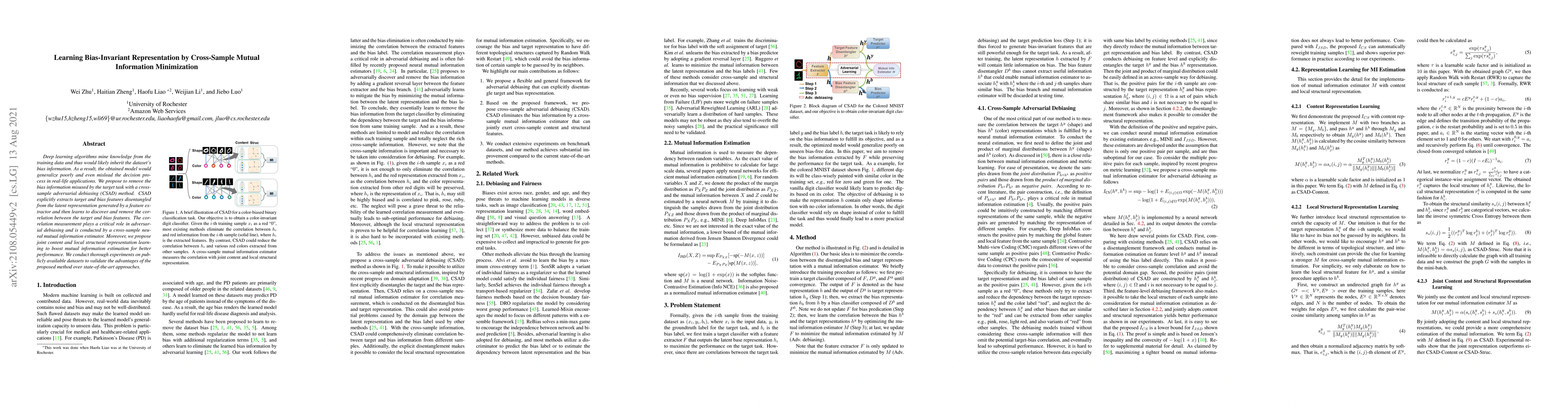 Deep learning algorithms mine knowledge from the training data and thus would likely inherit the dataset's bias information. As a result, the obtained model would generalize poorly and even mislead the decision process in real-life applications. We propose to remove the bias information misused by the target task with a cross-sample adversarial debiasing (CSAD) method. CSAD explicitly extracts target and bias features disentangled from the latent representation generated by a feature extractor and then learns to discover and remove the correlation between the target and bias features. The correlation measurement plays a critical role in adversarial debiasing and is conducted by a cross-sample neural mutual information estimator. Moreover, we propose joint content and local structural representation learning to boost mutual information estimation for better performance. We conduct thorough experiments on publicly available datasets to validate the advantages of the proposed method over state-of-the-art approaches.