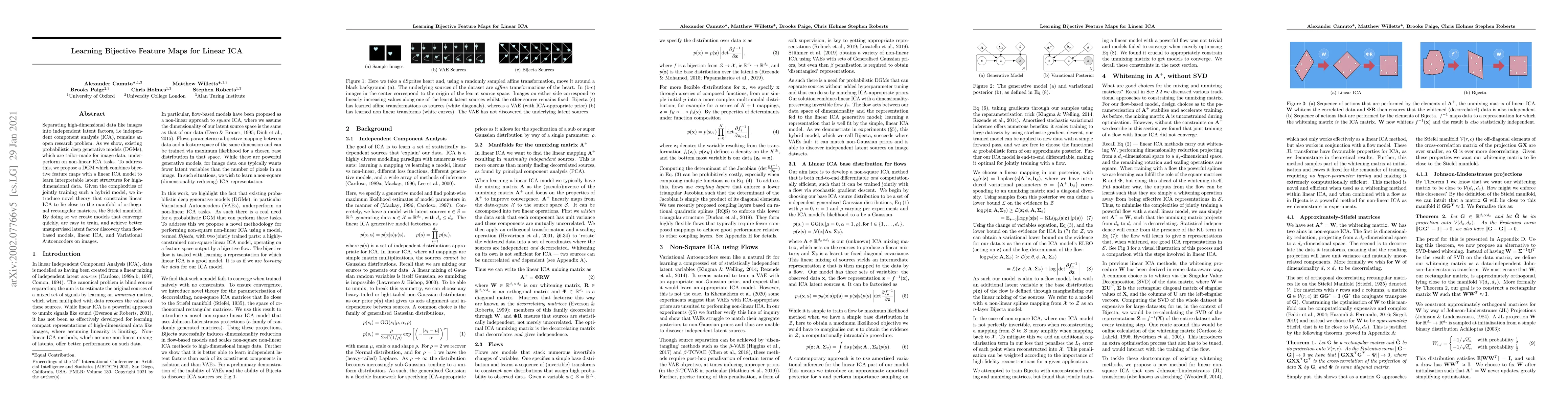 This paper proposes a deep generative model that integrates bijective feature maps with a linear ICA model to enhance the separation of high-dimensional data into independent latent factors. The authors introduce theoretical constraints to improve training efficiency and performance, achieving superior unsupervised latent factor discovery compared to existing methods.