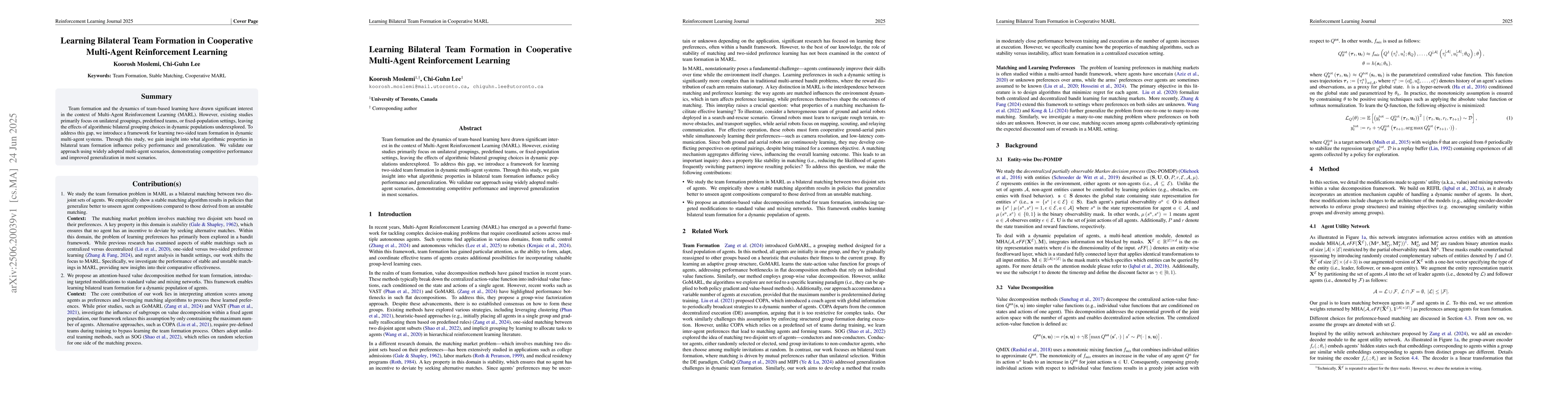 Team formation and the dynamics of team-based learning have drawn significant interest in the context of Multi-Agent Reinforcement Learning (MARL). However, existing studies primarily focus on unilateral groupings, predefined teams, or fixed-population settings, leaving the effects of algorithmic bilateral grouping choices in dynamic populations underexplored. To address this gap, we introduce a framework for learning two-sided team formation in dynamic multi-agent systems. Through this study, we gain insight into what algorithmic properties in bilateral team formation influence policy performance and generalization. We validate our approach using widely adopted multi-agent scenarios, demonstrating competitive performance and improved generalization in most scenarios.