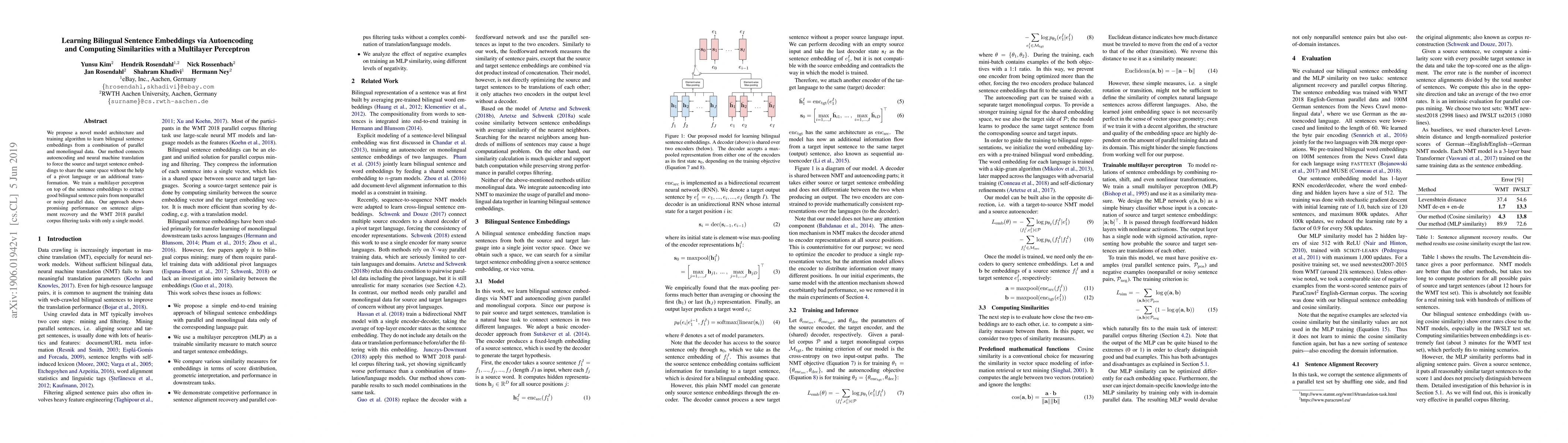 This paper introduces a novel model combining autoencoding and neural machine translation to learn bilingual sentence embeddings from parallel and monolingual data. It employs a multilayer perceptron to identify good bilingual sentence pairs from nonparallel or noisy data, demonstrating effective performance on sentence alignment and corpus filtering tasks.