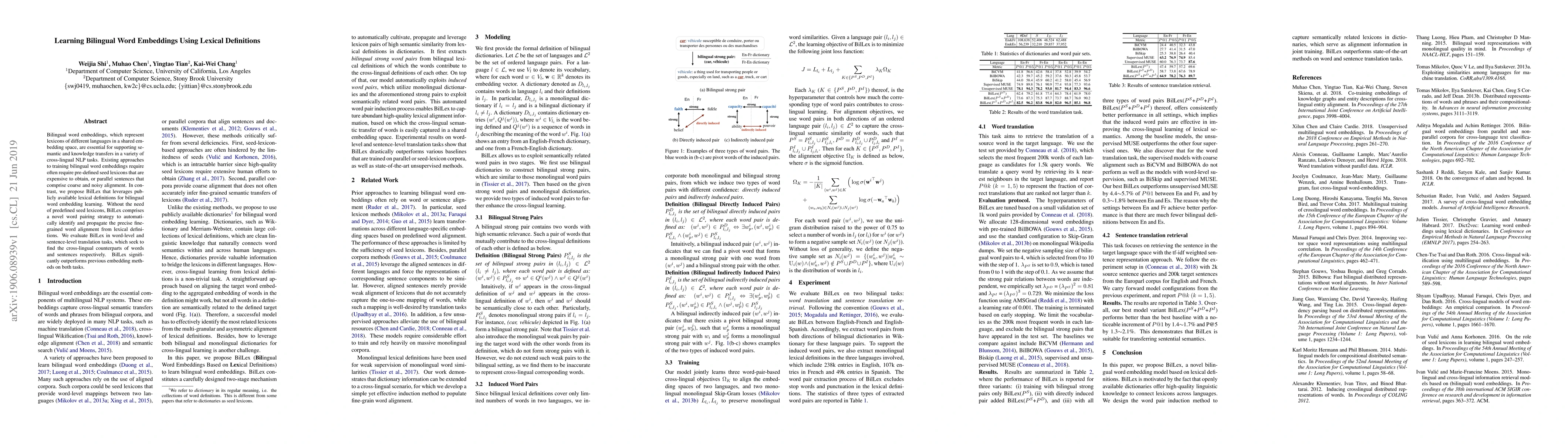 The paper proposes BilLex, a method for learning bilingual word embeddings using publicly available lexical definitions instead of expensive seed lexicons or noisy parallel sentences. BilLex employs a novel word pairing strategy to identify precise word alignments, achieving superior performance in word-level and sentence-level translation tasks compared to previous methods.