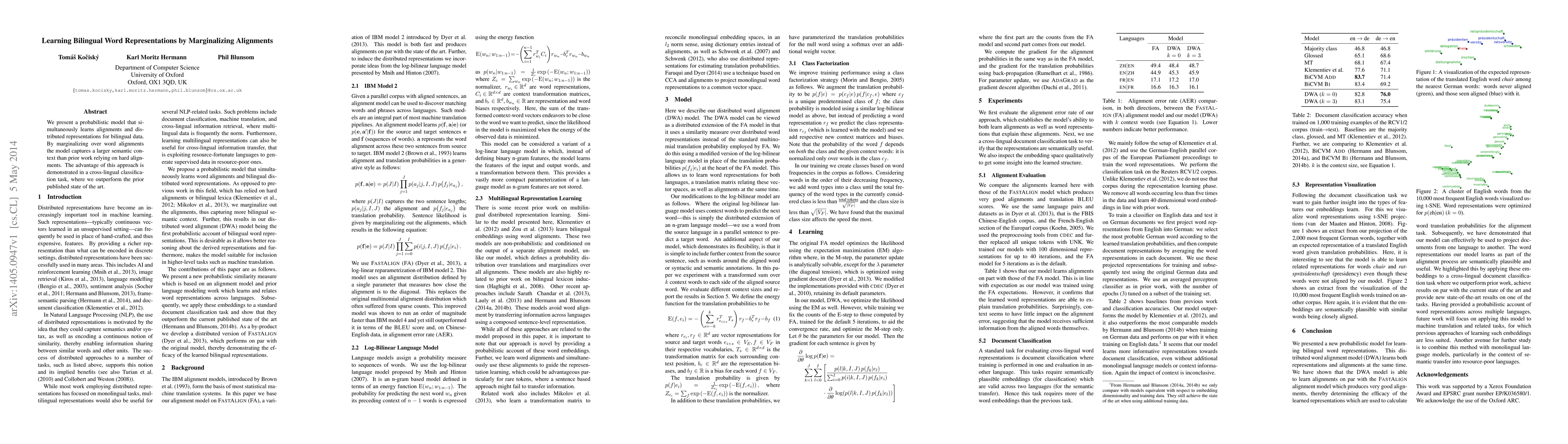 We present a probabilistic model that simultaneously learns alignments and distributed representations for bilingual data. By marginalizing over word alignments the model captures a larger semantic context than prior work relying on hard alignments. The advantage of this approach is demonstrated in a cross-lingual classification task, where we outperform the prior published state of the art.