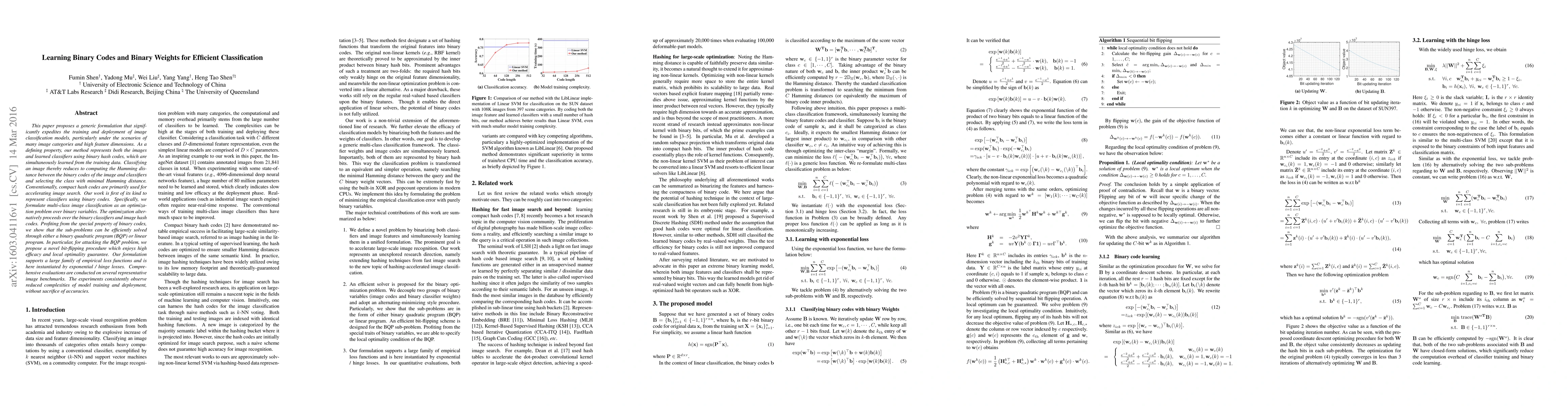 This paper proposes a generic formulation that significantly expedites the training and deployment of image classification models, particularly under the scenarios of many image categories and high feature dimensions. As a defining property, our method represents both the images and learned classifiers using binary hash codes, which are simultaneously learned from the training data. Classifying an image thereby reduces to computing the Hamming distance between the binary codes of the image and classifiers and selecting the class with minimal Hamming distance. Conventionally, compact hash codes are primarily used for accelerating image search. Our work is first of its kind to represent classifiers using binary codes. Specifically, we formulate multi-class image classification as an optimization problem over binary variables. The optimization alternatively proceeds over the binary classifiers and image hash codes. Profiting from the special property of binary codes, we show that the sub-problems can be efficiently solved through either a binary quadratic program (BQP) or linear program. In particular, for attacking the BQP problem, we propose a novel bit-flipping procedure which enjoys high efficacy and local optimality guarantee. Our formulation supports a large family of empirical loss functions and is here instantiated by exponential / hinge losses. Comprehensive evaluations are conducted on several representative image benchmarks. The experiments consistently observe reduced complexities of model training and deployment, without sacrifice of accuracies.