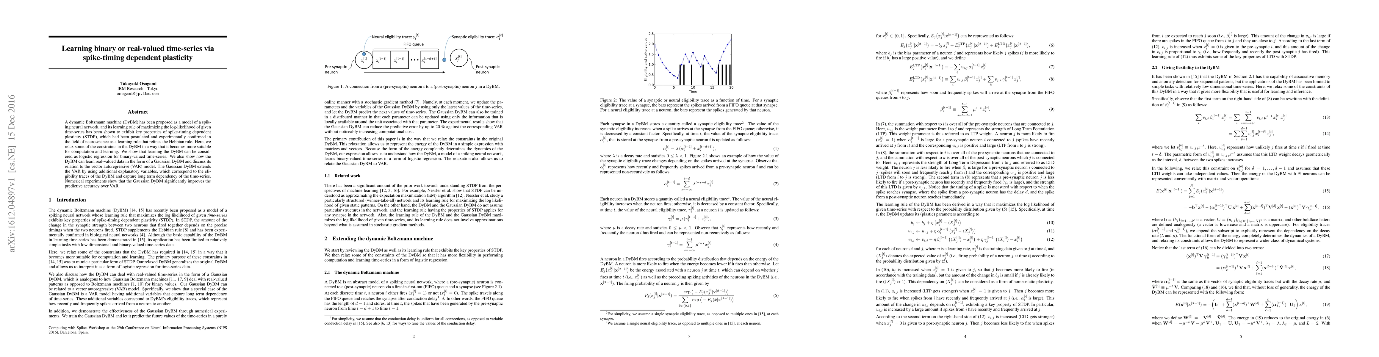 A dynamic Boltzmann machine (DyBM) has been proposed as a model of a spiking neural network, and its learning rule of maximizing the log-likelihood of given time-series has been shown to exhibit key properties of spike-timing dependent plasticity (STDP), which had been postulated and experimentally confirmed in the field of neuroscience as a learning rule that refines the Hebbian rule. Here, we relax some of the constraints in the DyBM in a way that it becomes more suitable for computation and learning. We show that learning the DyBM can be considered as logistic regression for binary-valued time-series. We also show how the DyBM can learn real-valued data in the form of a Gaussian DyBM and discuss its relation to the vector autoregressive (VAR) model. The Gaussian DyBM extends the VAR by using additional explanatory variables, which correspond to the eligibility traces of the DyBM and capture long term dependency of the time-series. Numerical experiments show that the Gaussian DyBM significantly improves the predictive accuracy over VAR.