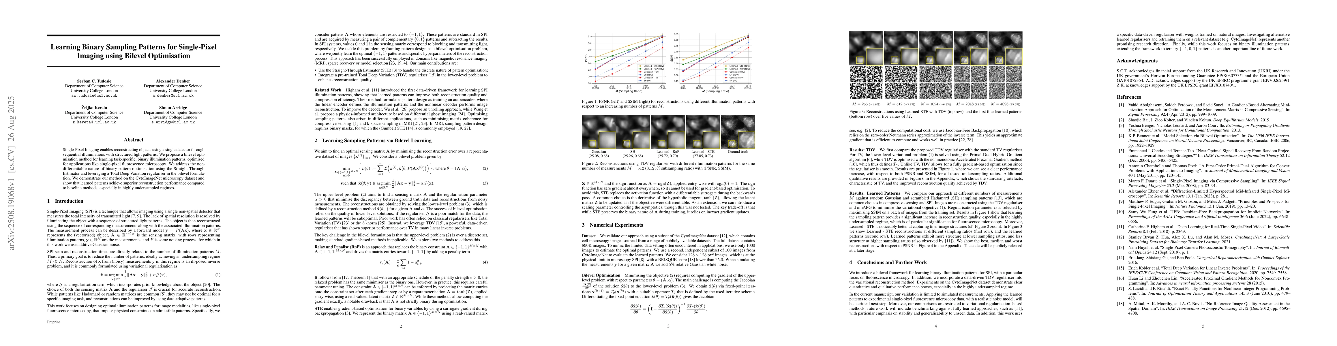 Single-Pixel Imaging enables reconstructing objects using a single detector through sequential illuminations with structured light patterns. We propose a bilevel optimisation method for learning task-specific, binary illumination patterns, optimised for applications like single-pixel fluorescence microscopy. We address the non-differentiable nature of binary pattern optimisation using the Straight-Through Estimator and leveraging a Total Deep Variation regulariser in the bilevel formulation. We demonstrate our method on the CytoImageNet microscopy dataset and show that learned patterns achieve superior reconstruction performance compared to baseline methods, especially in highly undersampled regimes.