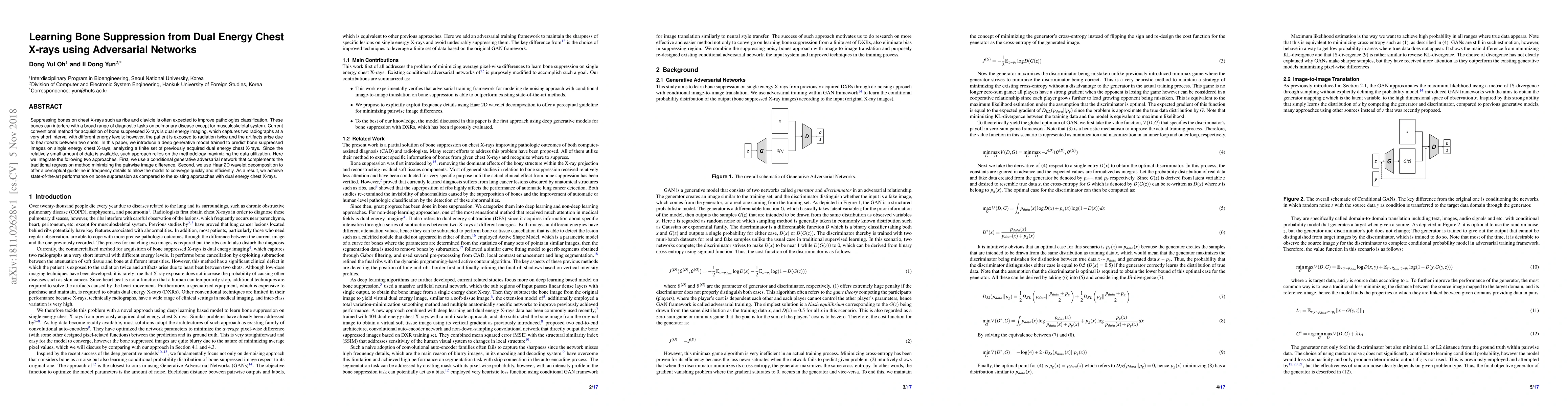 Suppressing bones on chest X-rays such as ribs and clavicle is often expected to improve pathologies classification. These bones can interfere with a broad range of diagnostic tasks on pulmonary disease except for musculoskeletal system. Current conventional method for acquisition of bone suppressed X-rays is dual energy imaging, which captures two radiographs at a very short interval with different energy levels; however, the patient is exposed to radiation twice and the artifacts arise due to heartbeats between two shots. In this paper, we introduce a deep generative model trained to predict bone suppressed images on single energy chest X-rays, analyzing a finite set of previously acquired dual energy chest X-rays. Since the relatively small amount of data is available, such approach relies on the methodology maximizing the data utilization. Here we integrate the following two approaches. First, we use a conditional generative adversarial network that complements the traditional regression method minimizing the pairwise image difference. Second, we use Haar 2D wavelet decomposition to offer a perceptual guideline in frequency details to allow the model to converge quickly and efficiently. As a result, we achieve state-of-the-art performance on bone suppression as compared to the existing approaches with dual energy chest X-rays.