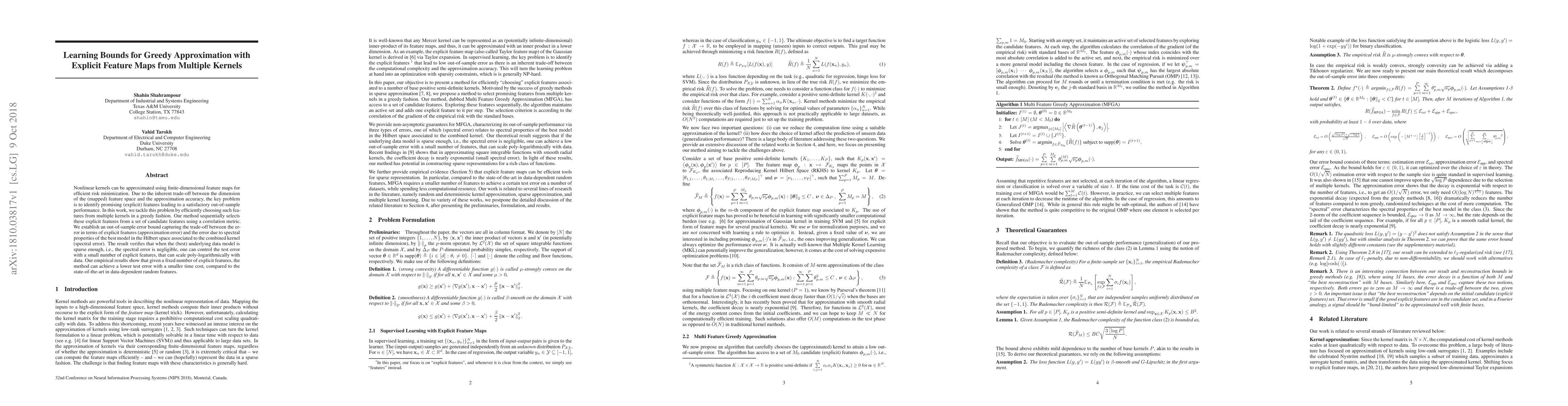 Nonlinear kernels can be approximated using finite-dimensional feature maps for efficient risk minimization. Due to the inherent trade-off between the dimension of the (mapped) feature space and the approximation accuracy, the key problem is to identify promising (explicit) features leading to a satisfactory out-of-sample performance. In this work, we tackle this problem by efficiently choosing such features from multiple kernels in a greedy fashion. Our method sequentially selects these explicit features from a set of candidate features using a correlation metric. We establish an out-of-sample error bound capturing the trade-off between the error in terms of explicit features (approximation error) and the error due to spectral properties of the best model in the Hilbert space associated to the combined kernel (spectral error). The result verifies that when the (best) underlying data model is sparse enough, i.e., the spectral error is negligible, one can control the test error with a small number of explicit features, that can scale poly-logarithmically with data. Our empirical results show that given a fixed number of explicit features, the method can achieve a lower test error with a smaller time cost, compared to the state-of-the-art in data-dependent random features.