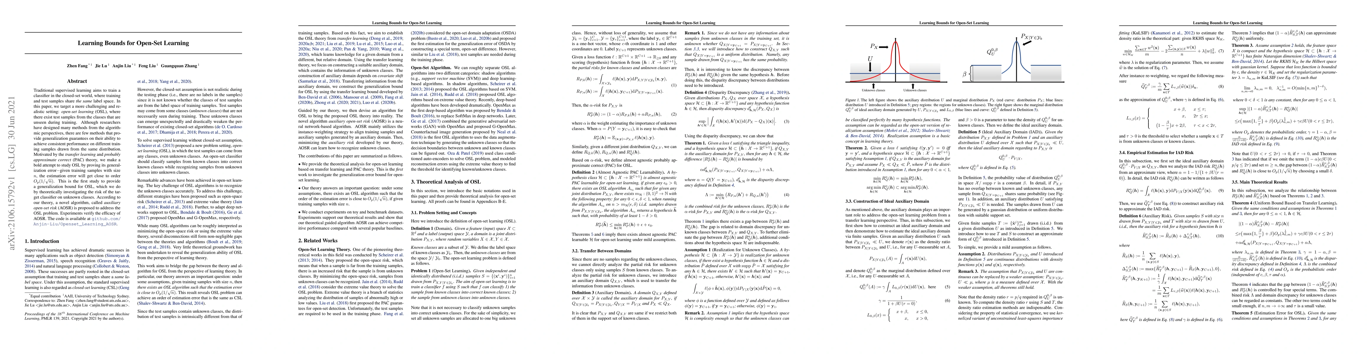 Traditional supervised learning aims to train a classifier in the closed-set world, where training and test samples share the same label space. In this paper, we target a more challenging and realistic setting: open-set learning (OSL), where there exist test samples from the classes that are unseen during training. Although researchers have designed many methods from the algorithmic perspectives, there are few methods that provide generalization guarantees on their ability to achieve consistent performance on different training samples drawn from the same distribution. Motivated by the transfer learning and probably approximate correct (PAC) theory, we make a bold attempt to study OSL by proving its generalization error-given training samples with size n, the estimation error will get close to order O_p(1/\sqrt{n}). This is the first study to provide a generalization bound for OSL, which we do by theoretically investigating the risk of the target classifier on unknown classes. According to our theory, a novel algorithm, called auxiliary open-set risk (AOSR) is proposed to address the OSL problem. Experiments verify the efficacy of AOSR. The code is available at github.com/Anjin-Liu/Openset_Learning_AOSR.