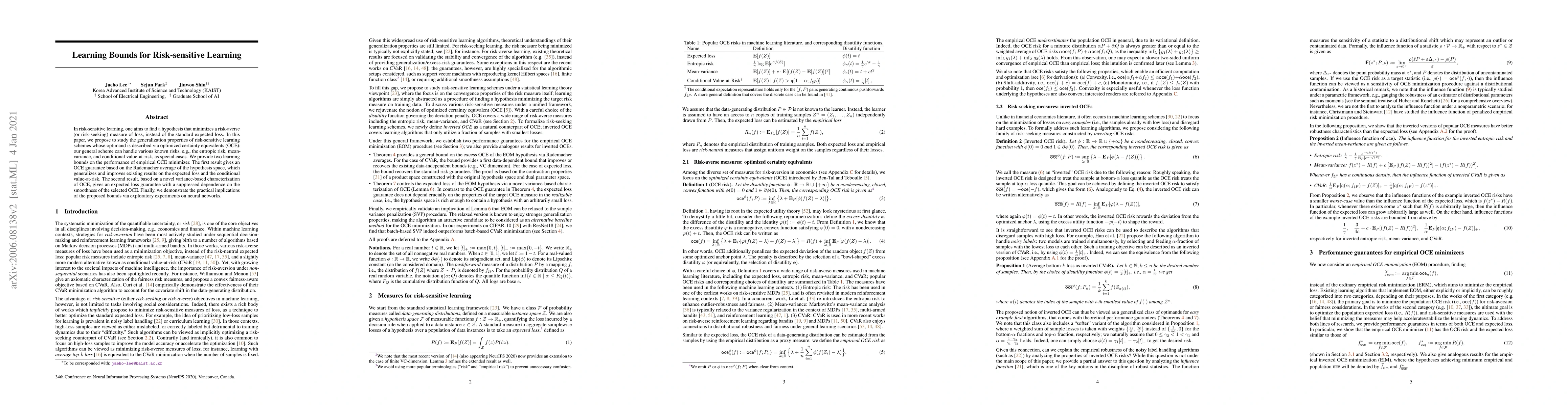 This paper explores the generalization properties of risk-sensitive learning schemes using optimized certainty equivalents (OCE) and provides two learning bounds. The first bound generalizes existing results on expected loss, while the second offers an expected loss guarantee with reduced dependence on OCE smoothness.