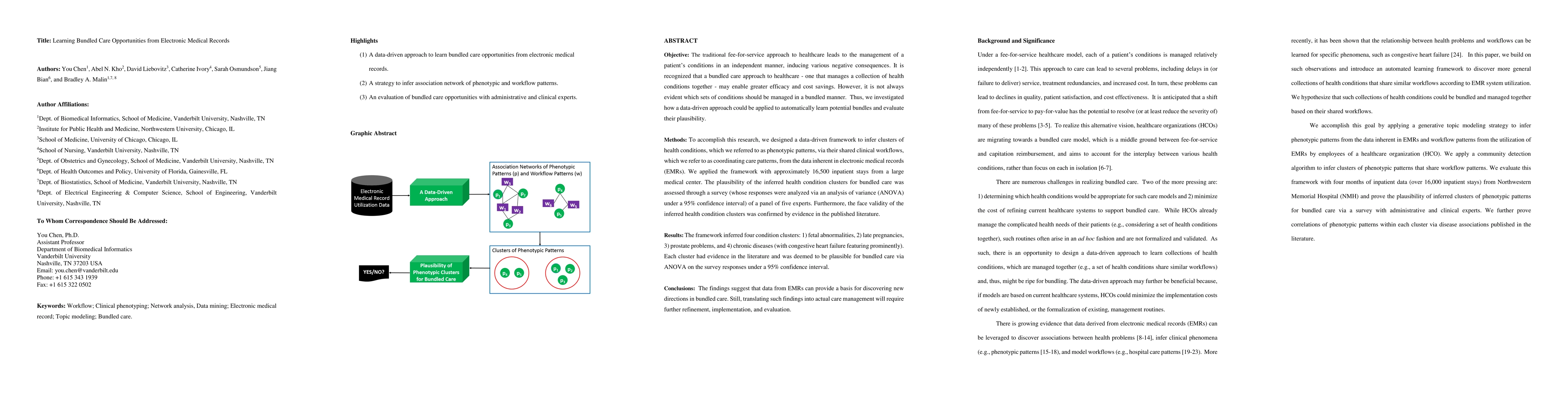 This study developed a data-driven framework to identify clusters of health conditions from electronic medical records based on shared clinical workflows, revealing four plausible bundled care clusters: fetal abnormalities, late pregnancies, prostate problems, and chronic diseases. Expert validation suggests potential for enhancing bundled care efficacy and cost savings.