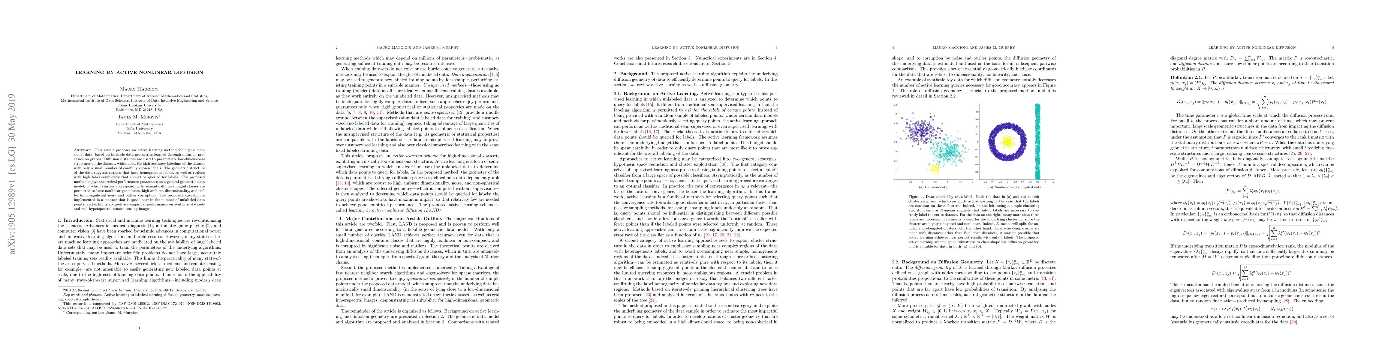 This research proposes a method to label high-dimensional data with active nonlinear diffusion, achieving high accuracy with only a few carefully chosen labels. It exhibits competitive performance on synthetic datasets and real hyperspectral images, offering theoretical guarantees for general geometric data models.