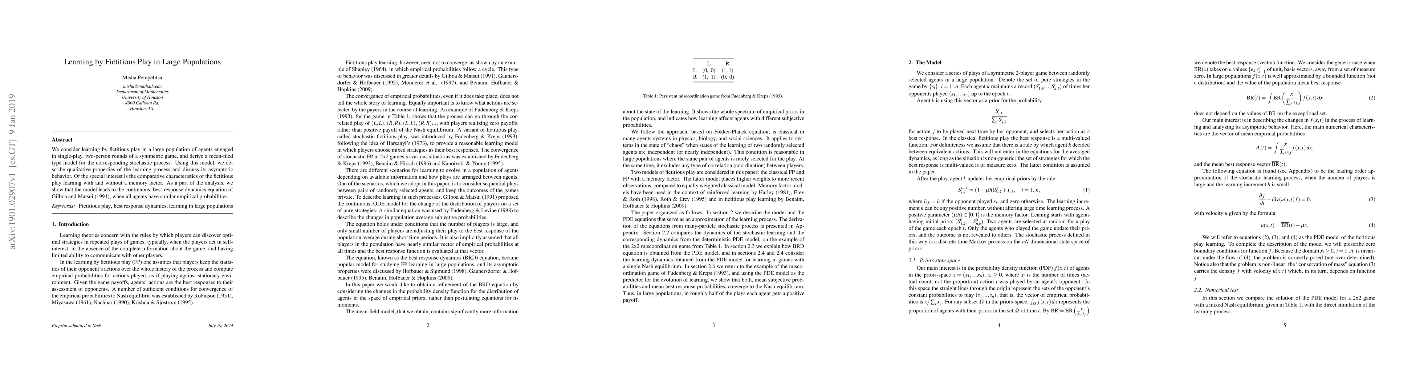 We consider learning by fictitious play in a large population of agents engaged in single-play, two-person rounds of a symmetric game, and derive a mean-filed type model for the corresponding stochastic process. Using this model, we describe qualitative properties of the learning process and discuss its asymptotic behavior. Of the special interest is the comparative characteristics of the fictitious play learning with and without a memory factor. As a part of the analysis, we show that the model leads to the continuous, best-response dynamics equation of Gilboa and Matsui (1991), when all agents have similar empirical probabilities.