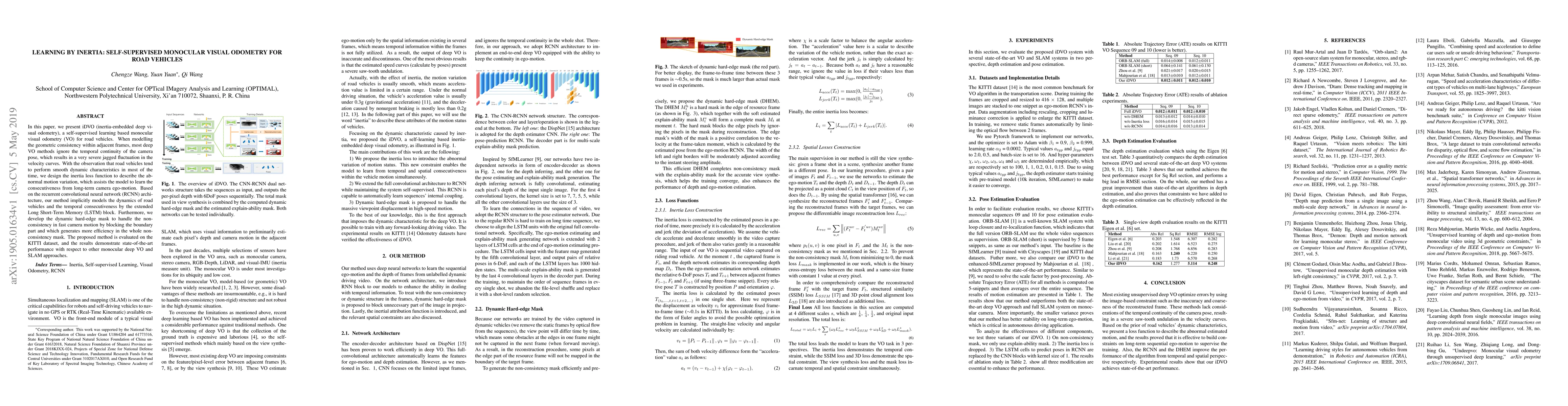 This paper introduces iDVO, a self-supervised monocular visual odometry method for road vehicles that incorporates an inertia loss function to model smooth dynamic characteristics, addressing jagged velocity fluctuations. The method uses an RCNN with an extended LSTM block and a dynamic hard-edge mask to achieve state-of-the-art performance on the KITTI dataset.