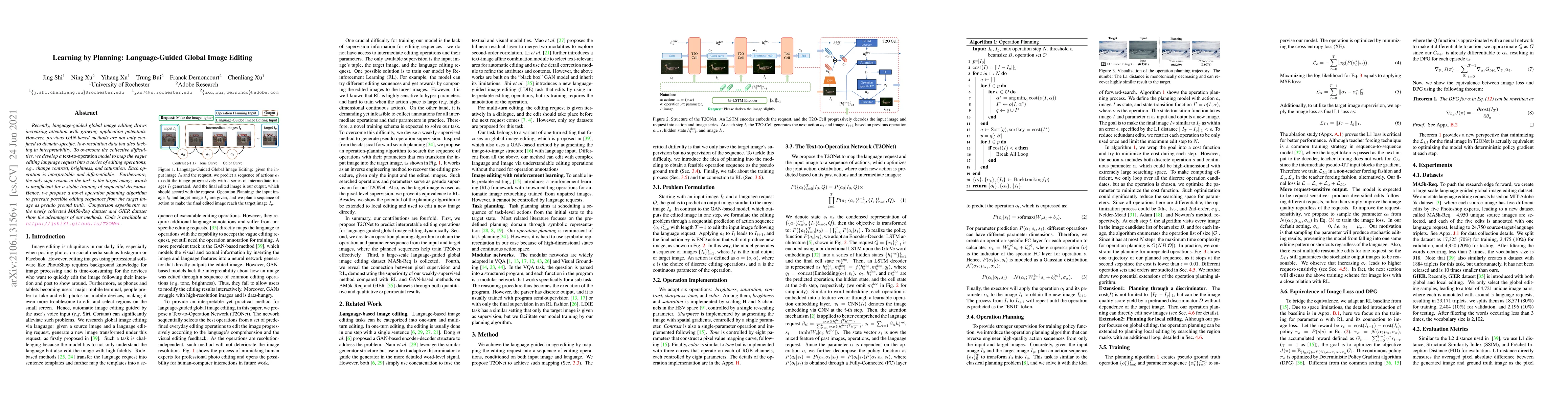 This research introduces a text-to-operation model for language-guided global image editing, addressing the limitations of previous GAN-based methods. It proposes a novel operation planning algorithm to generate editing sequences from target images, enabling stable training and interpretable operations, as demonstrated through experiments on MA5k-Req and GIER datasets.