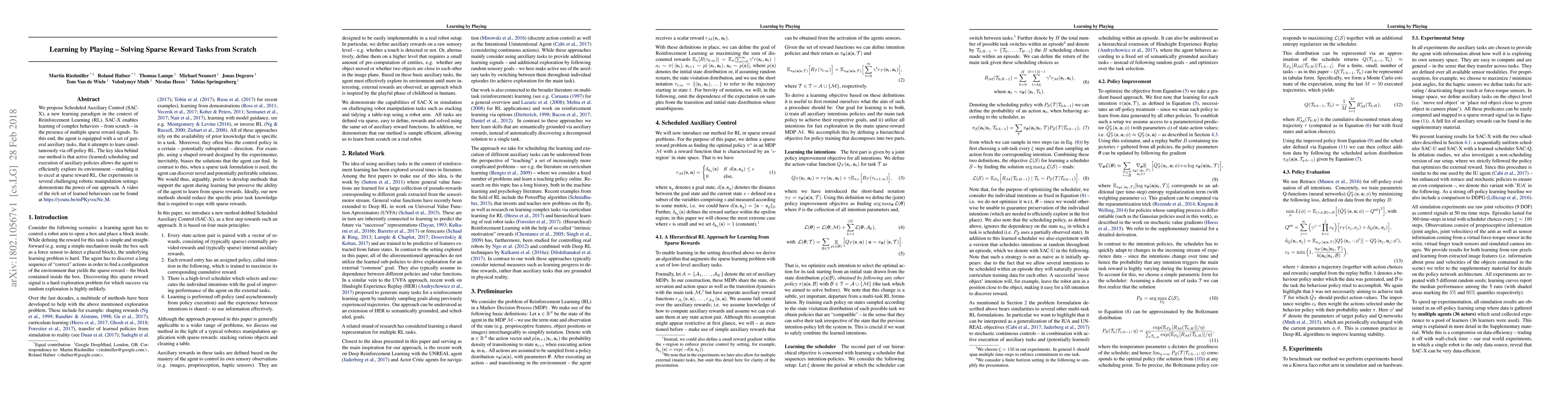 The paper introduces Scheduled Auxiliary Control (SAC-X), a novel Reinforcement Learning paradigm that uses auxiliary tasks to enable complex behavior learning from sparse rewards. The method leverages active scheduling of auxiliary policies to efficiently explore environments, as demonstrated in various robotic manipulation tasks.