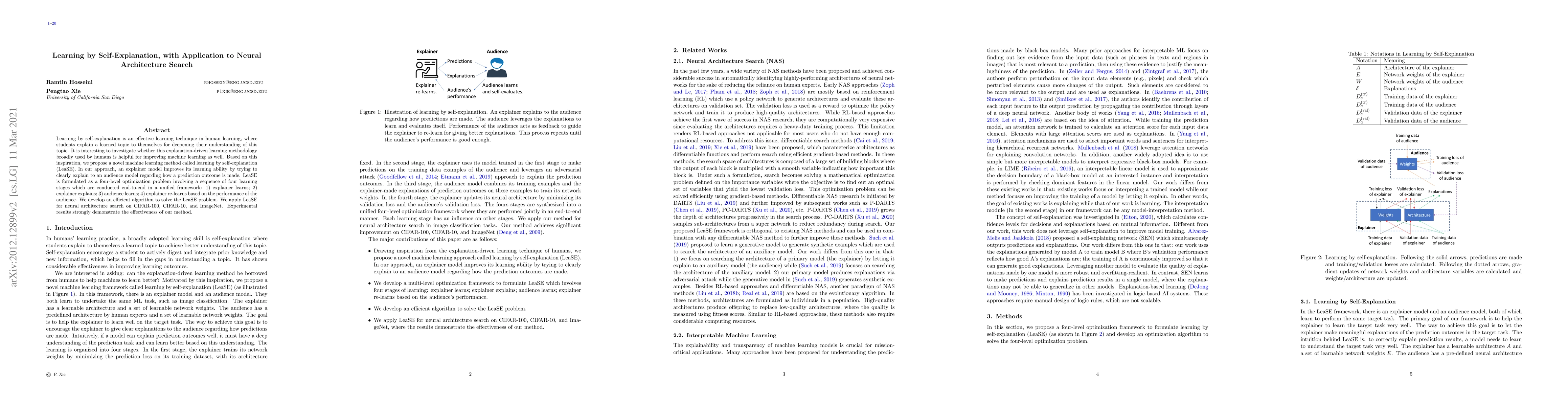 This paper proposes a novel machine learning method called learning by self-explanation (LeaSE) inspired by human learning techniques. LeaSE involves an explainer model improving its learning through explaining its predictions to an audience model, followed by iterative learning stages, and is shown to enhance neural architecture search performance on various datasets.