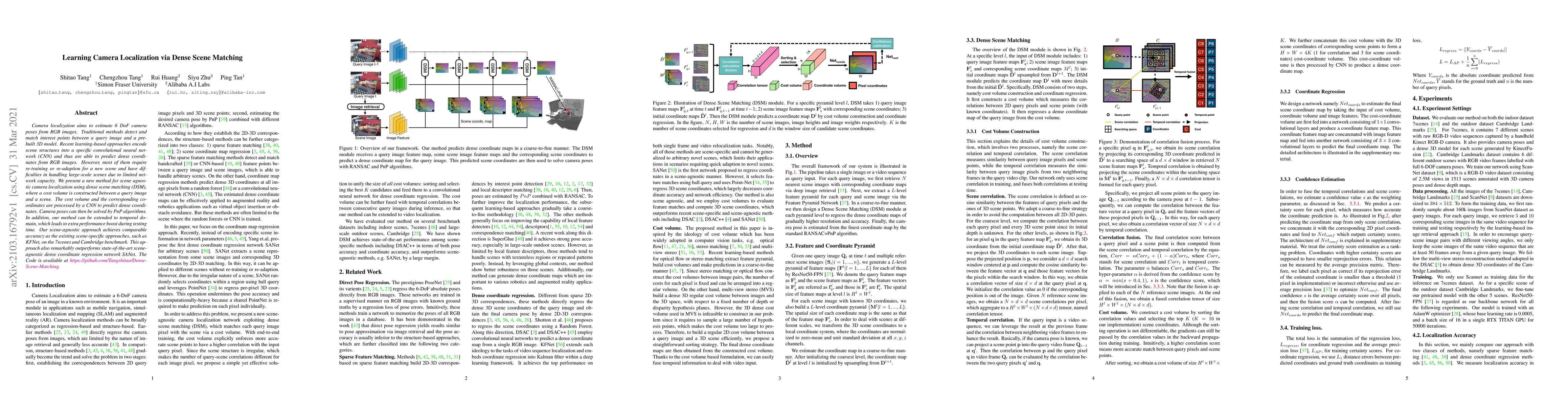 Camera localization aims to estimate 6 DoF camera poses from RGB images. Traditional methods detect and match interest points between a query image and a pre-built 3D model. Recent learning-based approaches encode scene structures into a specific convolutional neural network (CNN) and thus are able to predict dense coordinates from RGB images. However, most of them require re-training or re-adaption for a new scene and have difficulties in handling large-scale scenes due to limited network capacity. We present a new method for scene agnostic camera localization using dense scene matching (DSM), where a cost volume is constructed between a query image and a scene. The cost volume and the corresponding coordinates are processed by a CNN to predict dense coordinates. Camera poses can then be solved by PnP algorithms. In addition, our method can be extended to temporal domain, which leads to extra performance boost during testing time. Our scene-agnostic approach achieves comparable accuracy as the existing scene-specific approaches, such as KFNet, on the 7scenes and Cambridge benchmark. This approach also remarkably outperforms state-of-the-art scene-agnostic dense coordinate regression network SANet. The Code is available at https://github.com/Tangshitao/Dense-Scene-Matching.