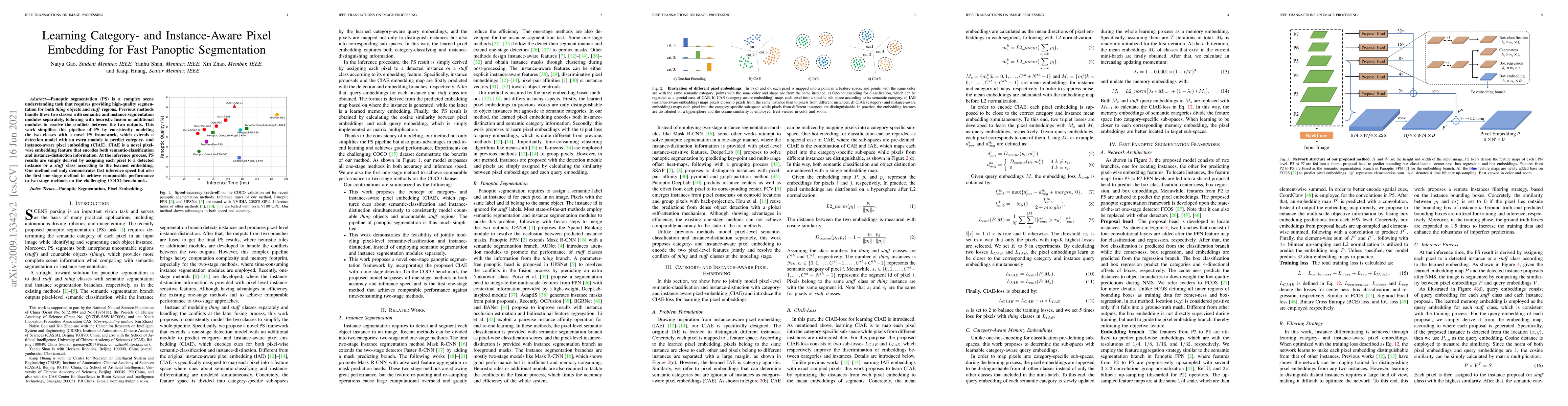 This paper proposes a novel one-stage framework for panoptic segmentation that integrates category- and instance-aware pixel embedding (CIAE) to simultaneously model both thing objects and stuff regions, achieving fast inference speeds and competitive performance compared to two-stage methods on the COCO benchmark.