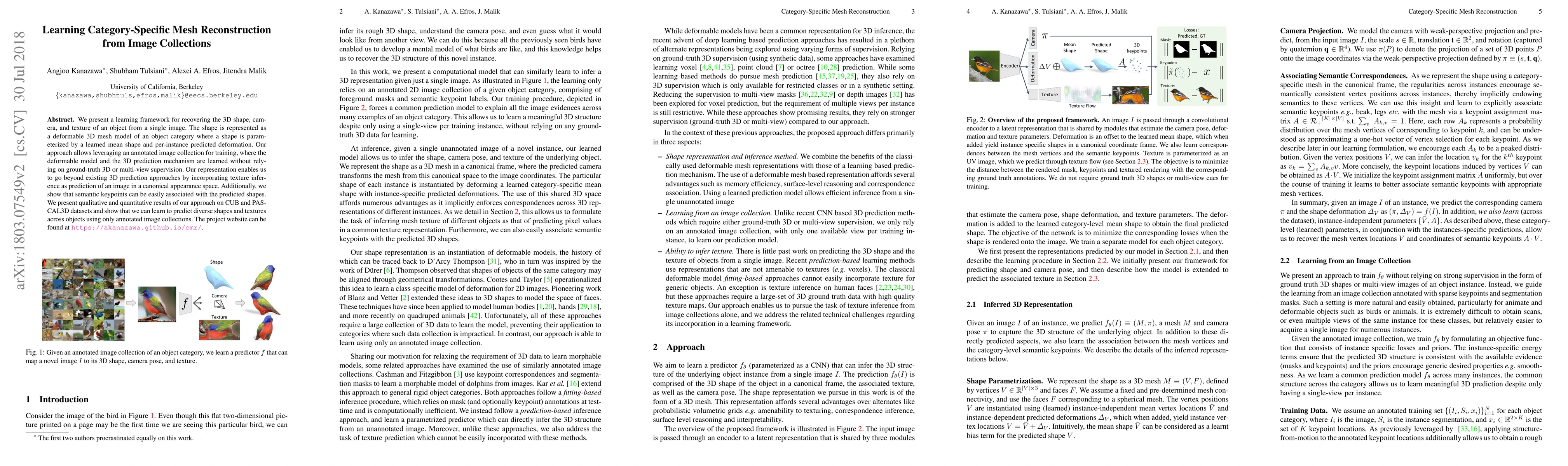 This paper introduces a framework for reconstructing 3D mesh models of object categories from single images, leveraging annotated image collections for training without 3D supervision. The approach predicts deformable 3D shapes, textures, and semantic keypoints, demonstrating effectiveness on CUB and PASCAL3D datasets.