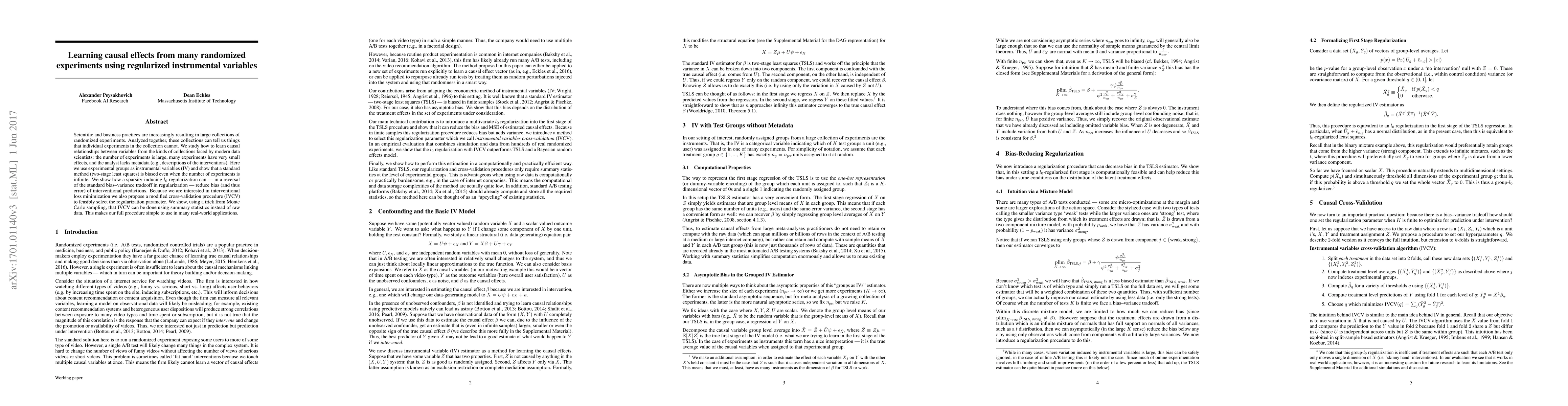 This paper proposes methods to learn causal effects from large collections of randomized experiments using regularized instrumental variables, addressing the bias in standard two-stage least squares when experiments are numerous and have small effects. It introduces a regularization technique to reduce bias and proposes a modified cross-validation procedure for parameter selection, enabling practical application in real-world data scenarios.