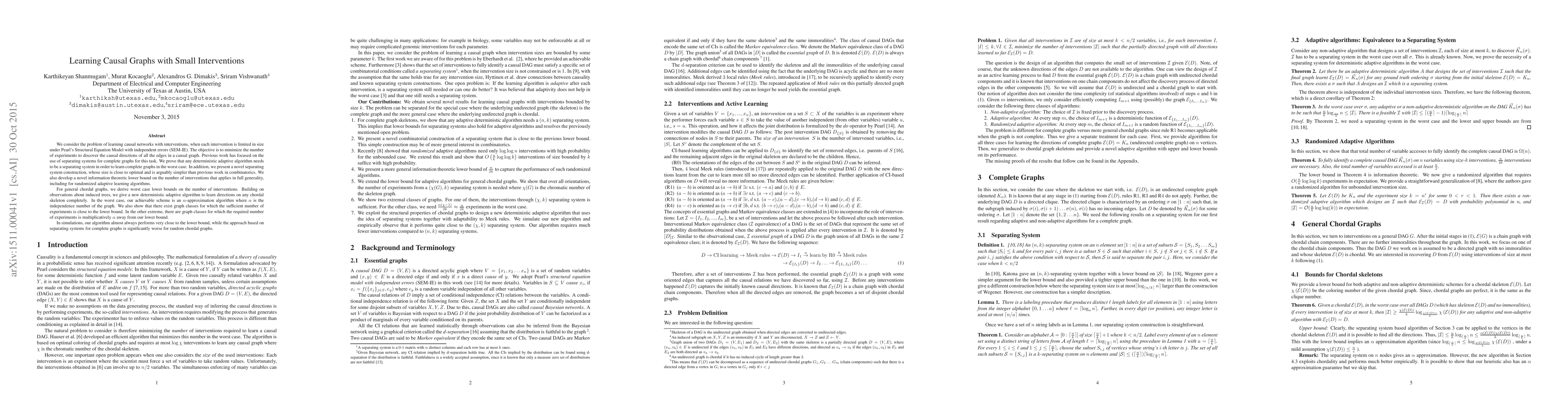 We consider the problem of learning causal networks with interventions, when each intervention is limited in size under Pearl's Structural Equation Model with independent errors (SEM-IE). The objective is to minimize the number of experiments to discover the causal directions of all the edges in a causal graph. Previous work has focused on the use of separating systems for complete graphs for this task. We prove that any deterministic adaptive algorithm needs to be a separating system in order to learn complete graphs in the worst case. In addition, we present a novel separating system construction, whose size is close to optimal and is arguably simpler than previous work in combinatorics. We also develop a novel information theoretic lower bound on the number of interventions that applies in full generality, including for randomized adaptive learning algorithms. For general chordal graphs, we derive worst case lower bounds on the number of interventions. Building on observations about induced trees, we give a new deterministic adaptive algorithm to learn directions on any chordal skeleton completely. In the worst case, our achievable scheme is an $\alpha$-approximation algorithm where $\alpha$ is the independence number of the graph. We also show that there exist graph classes for which the sufficient number of experiments is close to the lower bound. In the other extreme, there are graph classes for which the required number of experiments is multiplicatively $\alpha$ away from our lower bound. In simulations, our algorithm almost always performs very close to the lower bound, while the approach based on separating systems for complete graphs is significantly worse for random chordal graphs.