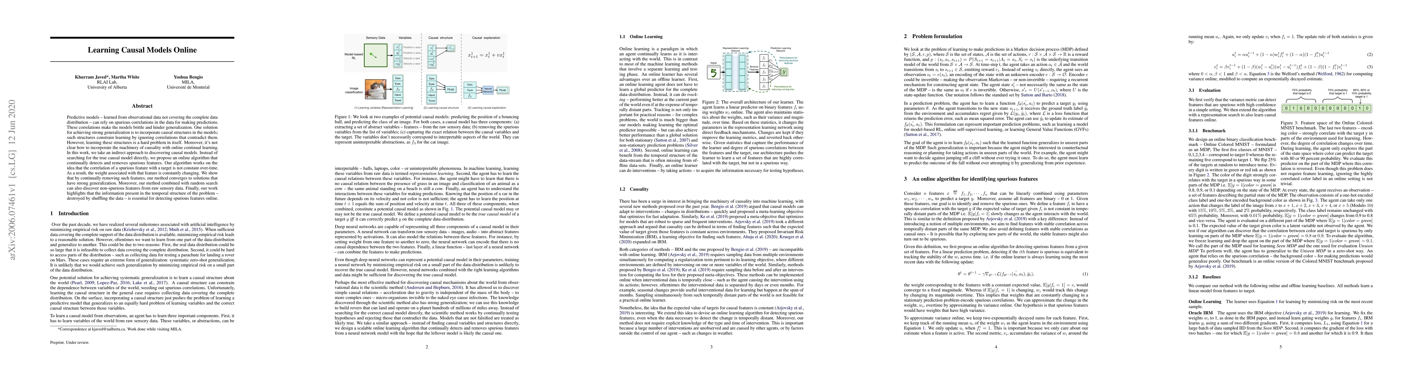 Predictive models -- learned from observational data not covering the complete data distribution -- can rely on spurious correlations in the data for making predictions. These correlations make the models brittle and hinder generalization. One solution for achieving strong generalization is to incorporate causal structures in the models; such structures constrain learning by ignoring correlations that contradict them. However, learning these structures is a hard problem in itself. Moreover, it's not clear how to incorporate the machinery of causality with online continual learning. In this work, we take an indirect approach to discovering causal models. Instead of searching for the true causal model directly, we propose an online algorithm that continually detects and removes spurious features. Our algorithm works on the idea that the correlation of a spurious feature with a target is not constant over-time. As a result, the weight associated with that feature is constantly changing. We show that by continually removing such features, our method converges to solutions that have strong generalization. Moreover, our method combined with random search can also discover non-spurious features from raw sensory data. Finally, our work highlights that the information present in the temporal structure of the problem -- destroyed by shuffling the data -- is essential for detecting spurious features online.