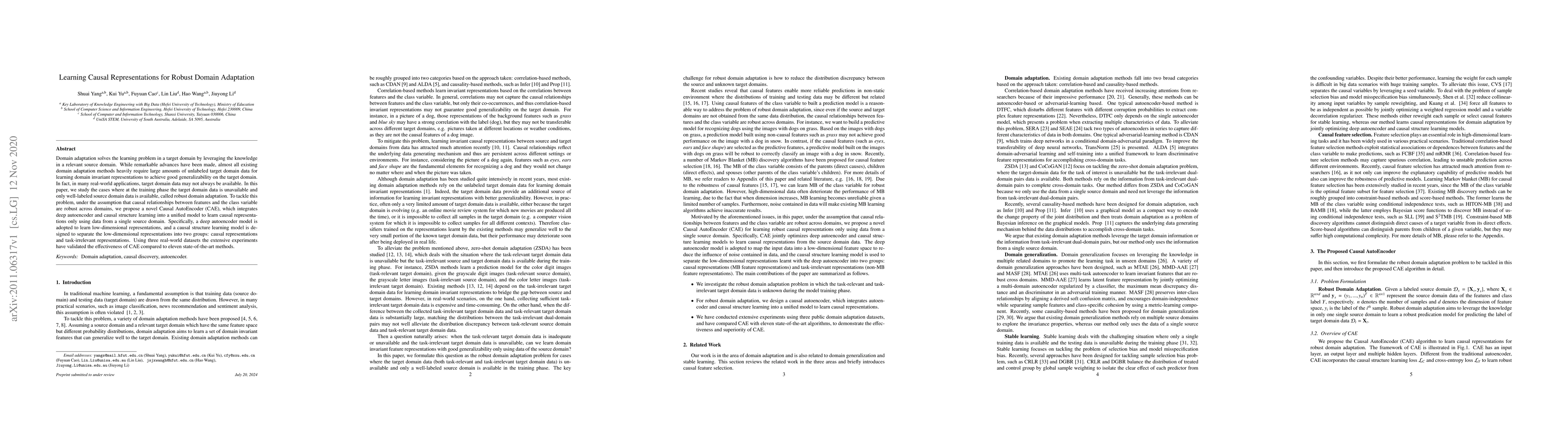Domain adaptation solves the learning problem in a target domain by leveraging the knowledge in a relevant source domain. While remarkable advances have been made, almost all existing domain adaptation methods heavily require large amounts of unlabeled target domain data for learning domain invariant representations to achieve good generalizability on the target domain. In fact, in many real-world applications, target domain data may not always be available. In this paper, we study the cases where at the training phase the target domain data is unavailable and only well-labeled source domain data is available, called robust domain adaptation. To tackle this problem, under the assumption that causal relationships between features and the class variable are robust across domains, we propose a novel Causal AutoEncoder (CAE), which integrates deep autoencoder and causal structure learning into a unified model to learn causal representations only using data from a single source domain. Specifically, a deep autoencoder model is adopted to learn low-dimensional representations, and a causal structure learning model is designed to separate the low-dimensional representations into two groups: causal representations and task-irrelevant representations. Using three real-world datasets the extensive experiments have validated the effectiveness of CAE compared to eleven state-of-the-art methods.