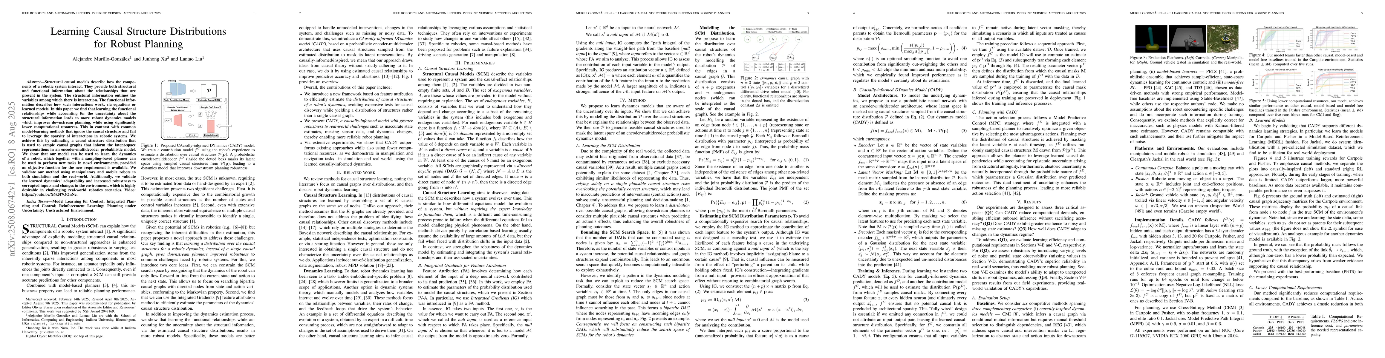 Structural causal models describe how the components of a robotic system interact. They provide both structural and functional information about the relationships that are present in the system. The structural information outlines the variables among which there is interaction. The functional information describes how such interactions work, via equations or learned models. In this paper we find that learning the functional relationships while accounting for the uncertainty about the structural information leads to more robust dynamics models which improves downstream planning, while using significantly lower computational resources. This in contrast with common model-learning methods that ignore the causal structure and fail to leverage the sparsity of interactions in robotic systems. We achieve this by estimating a causal structure distribution that is used to sample causal graphs that inform the latent-space representations in an encoder-multidecoder probabilistic model. We show that our model can be used to learn the dynamics of a robot, which together with a sampling-based planner can be used to perform new tasks in novel environments, provided an objective function for the new requirement is available. We validate our method using manipulators and mobile robots in both simulation and the real-world. Additionally, we validate the learned dynamics' adaptability and increased robustness to corrupted inputs and changes in the environment, which is highly desirable in challenging real-world robotics scenarios. Video: https://youtu.be/X6k5t7OOnNc.