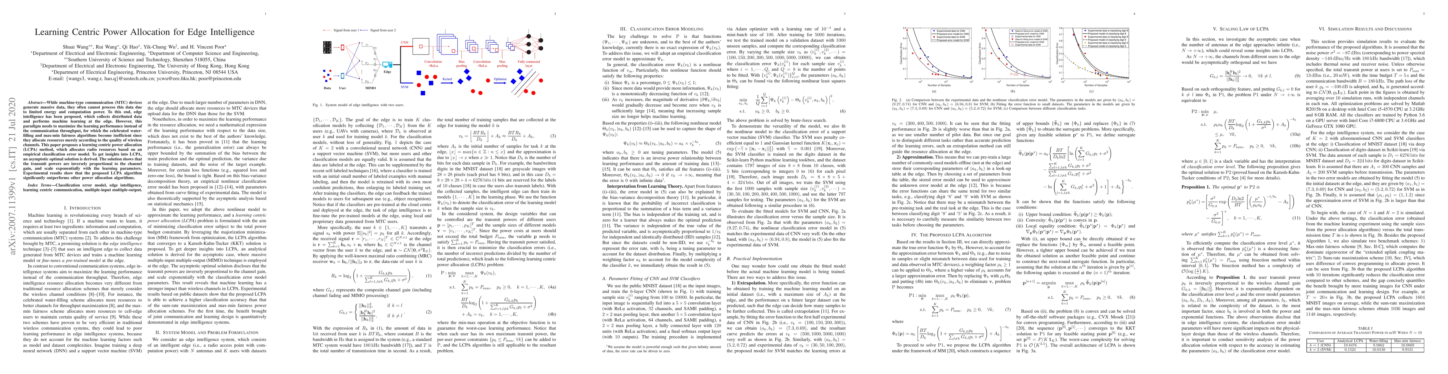 This paper proposes a learning centric power allocation (LCPA) method for edge intelligence to maximize machine learning performance in MTC devices. The LCPA method allocates radio resources based on an empirical classification error model, outperforming traditional resource allocation methods.