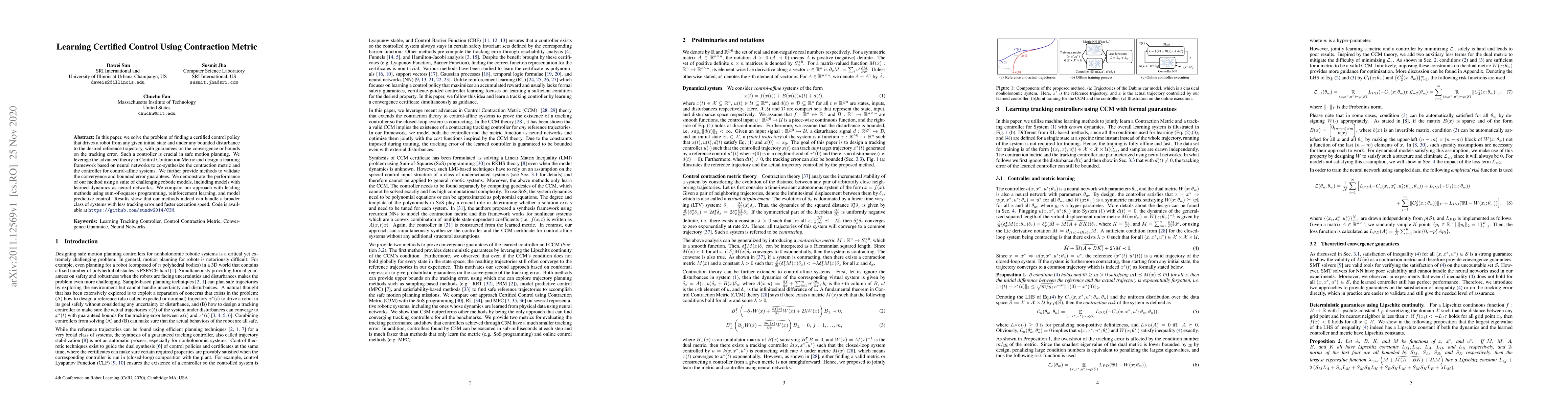 In this paper, we solve the problem of finding a certified control policy that drives a robot from any given initial state and under any bounded disturbance to the desired reference trajectory, with guarantees on the convergence or bounds on the tracking error. Such a controller is crucial in safe motion planning. We leverage the advanced theory in Control Contraction Metric and design a learning framework based on neural networks to co-synthesize the contraction metric and the controller for control-affine systems. We further provide methods to validate the convergence and bounded error guarantees. We demonstrate the performance of our method using a suite of challenging robotic models, including models with learned dynamics as neural networks. We compare our approach with leading methods using sum-of-squares programming, reinforcement learning, and model predictive control. Results show that our methods indeed can handle a broader class of systems with less tracking error and faster execution speed. Code is available at https://github.com/sundw2014/C3M.